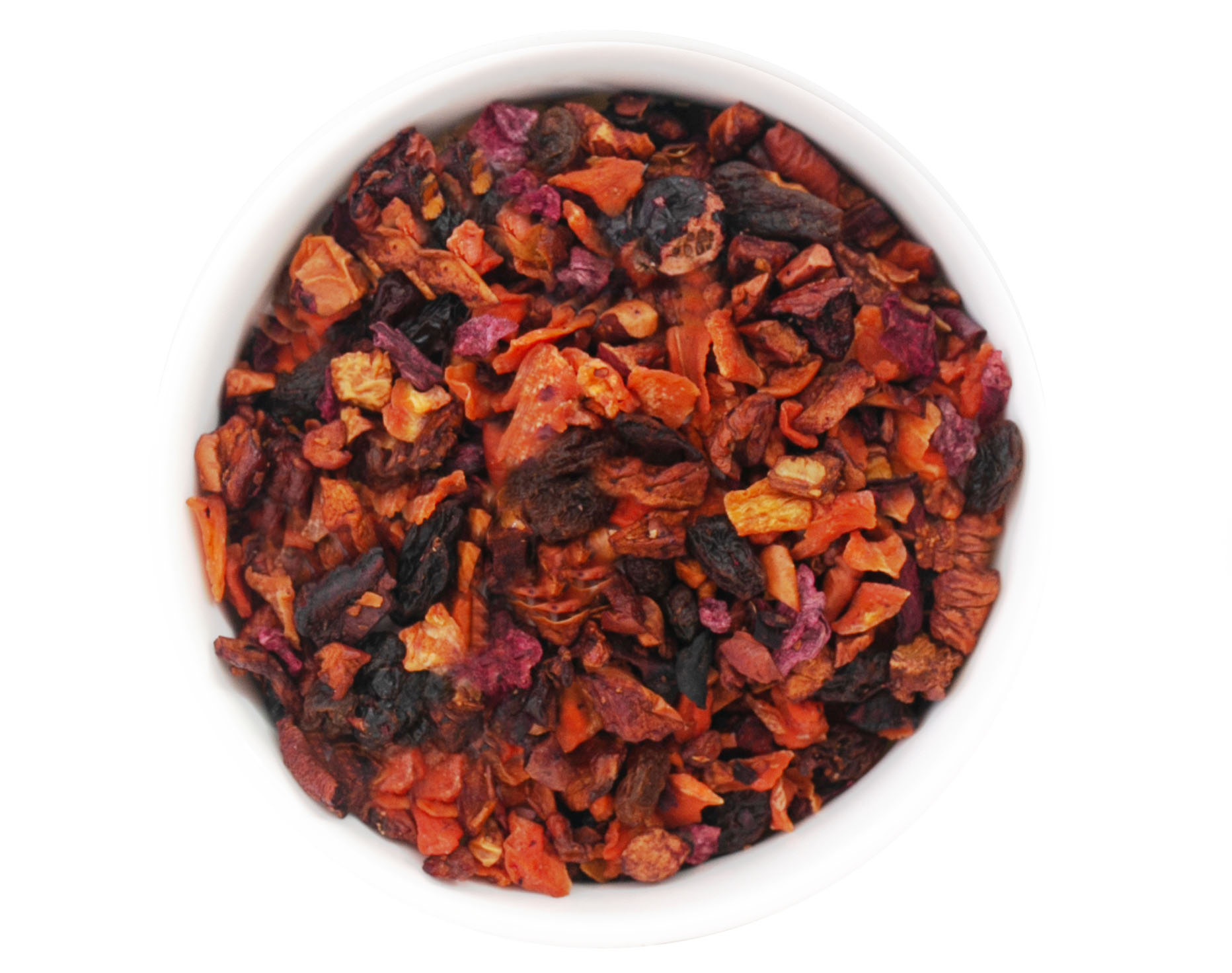 Ingrédients : Morceaux de pomme (pomme, acidifiant : acide citrique), raisins secs, morceaux de carotte, morceaux de betterave rouges, écorces d'orange (8%), morceaux de gingembre (gingembre, sucre) (8%), fleurs d'hibiscus, arôme naturel, fleurs de mauve, fleurs de rose.
