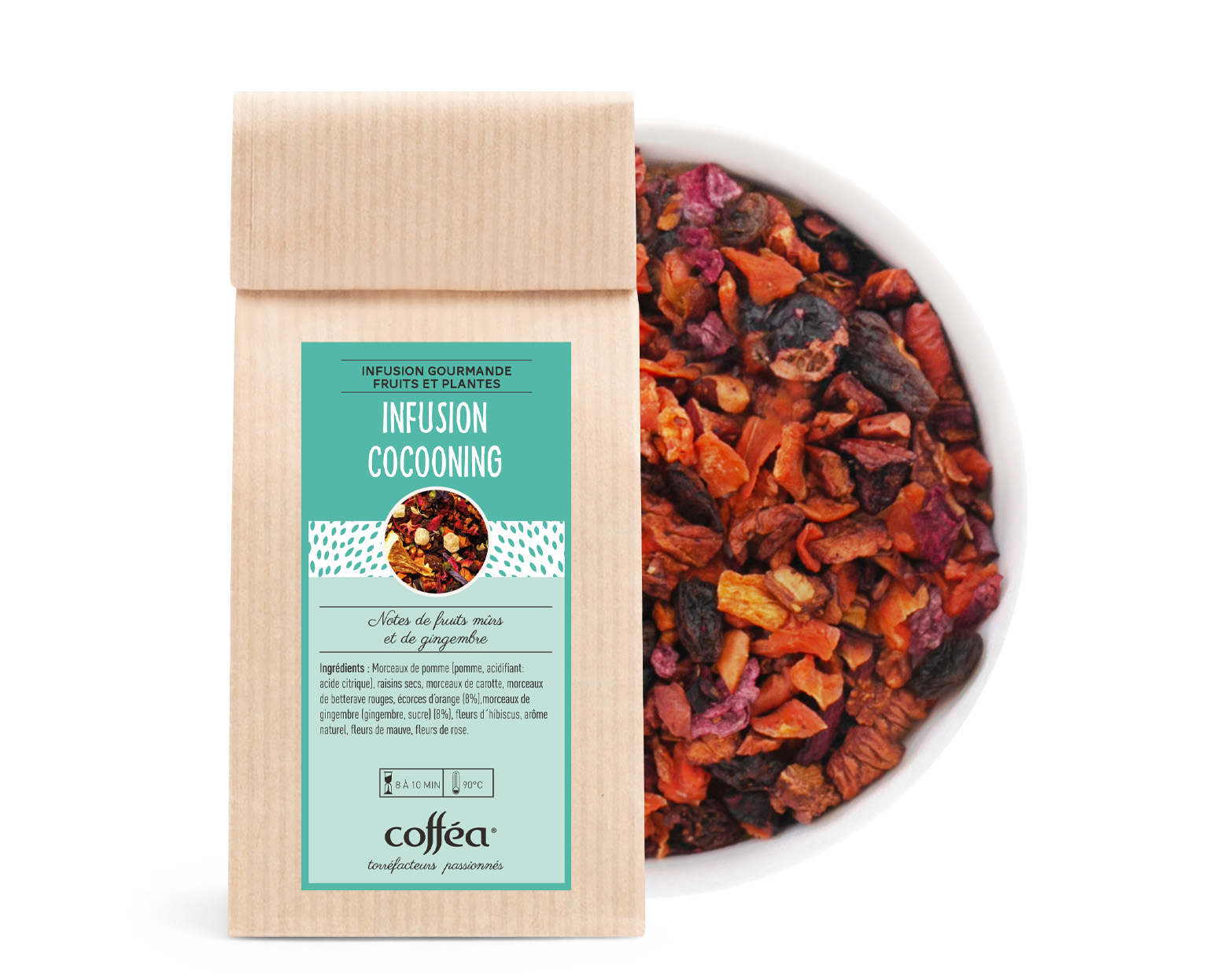 L'Infusion Cocooning est une boisson douce et chaleureuse qui évoque une sensation de confort et de sérénité. Ses saveurs fruitées et légèrement épicées apportent une touche de douceur et de chaleur, tandis que les notes subtiles de gingembre et d'hibiscus éveillent les sens tout en restant apaisantes. Parfaite pour les moments de détente après une journée bien remplie, elle incarne l’art de vivre scandinave et le bien-être à l’état pur.
