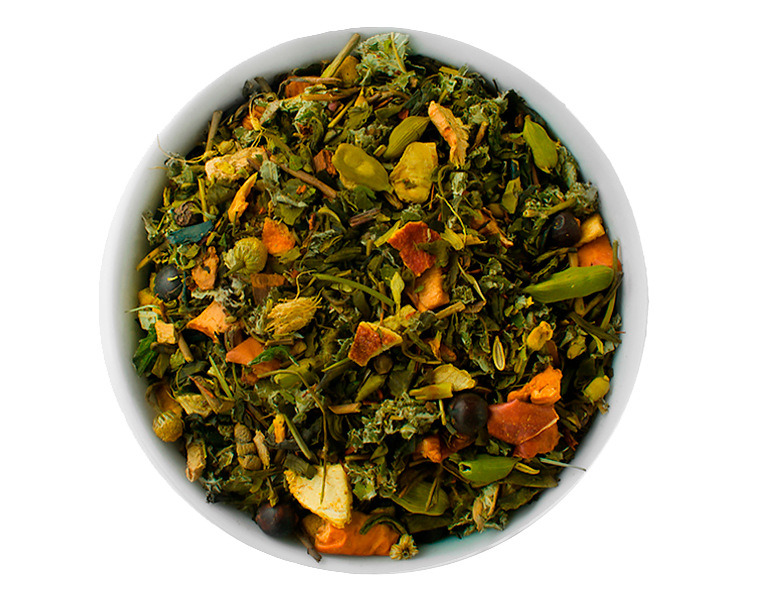 Ingrédients : Morceaux de pomme, écorces d’orange (12 %), rooibos, morceaux de gingembre, écorces de cannelle, feuilles de framboisier, fenouil, fleurs de camomille, alchémille, millepertuis, cardamome, arômes naturels, poivre noir, baies de genévrier, potentille ansérine