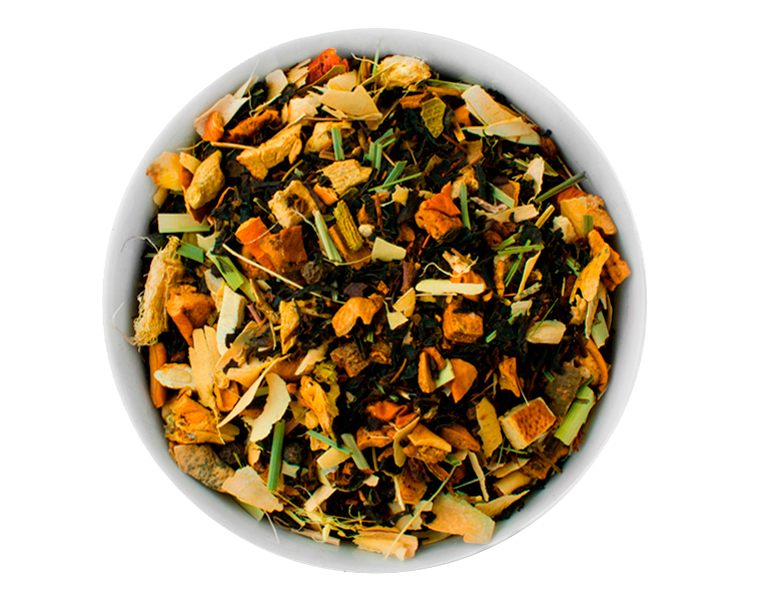 Ingrédients : Morceaux de pomme, rooibos, morceaux de gingembre (10 %), cosses de haricots, écorce de cannelle, gui, citronnelle, millepertuis, arômes, poivre noir, clous de girofle, cardamome, racine de ginseng (1 %), écorces de citron