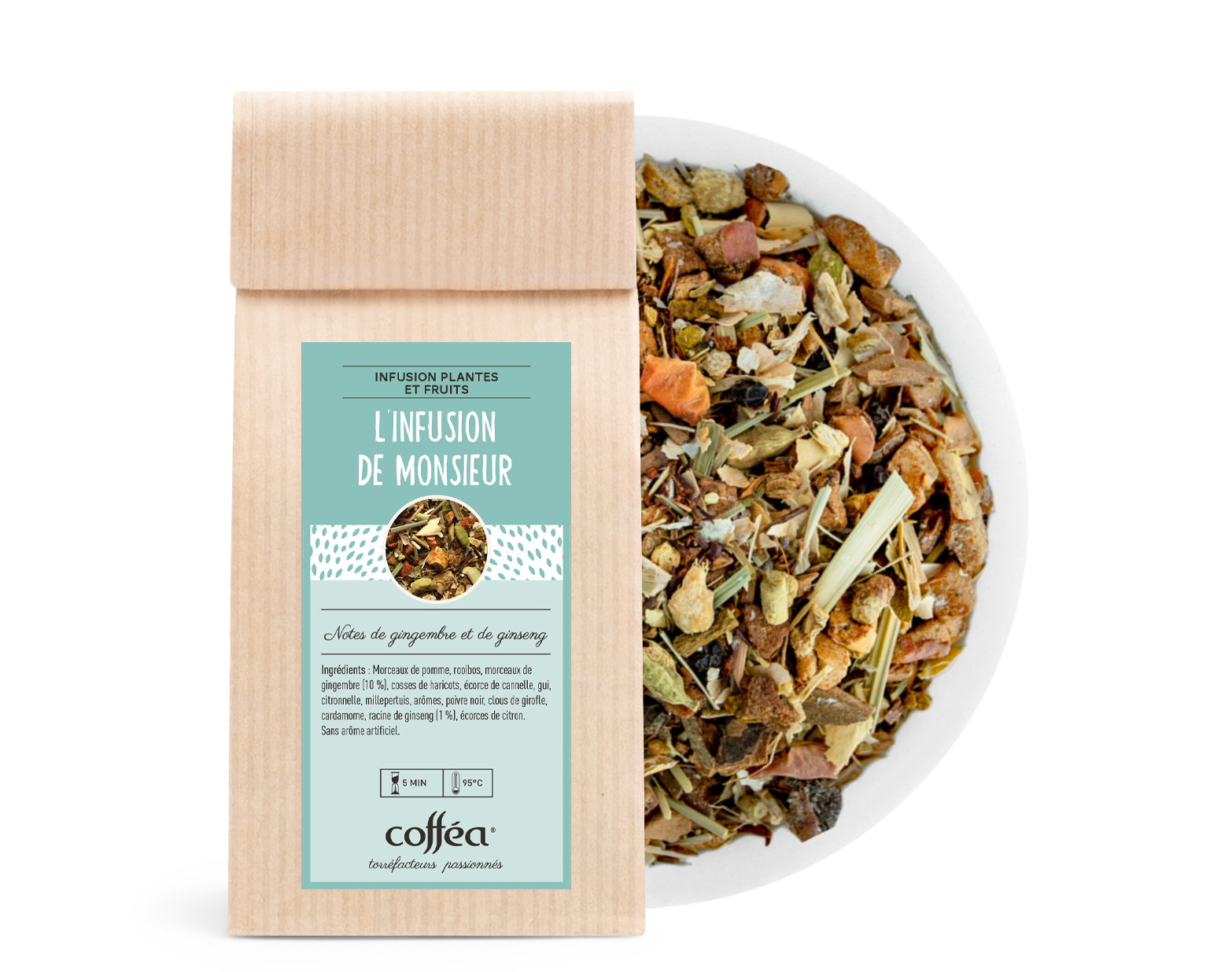 L’Infusion de Monsieur est une composition originale, alliant la chaleur du gingembre et du poivre noir à la douceur de la pomme et du rooibos. Parsemée de racine de ginseng, de millepertuis et de cardamome, cette infusion aux multiples bienfaits est idéale pour les amateurs de saveurs toniques et épicées.