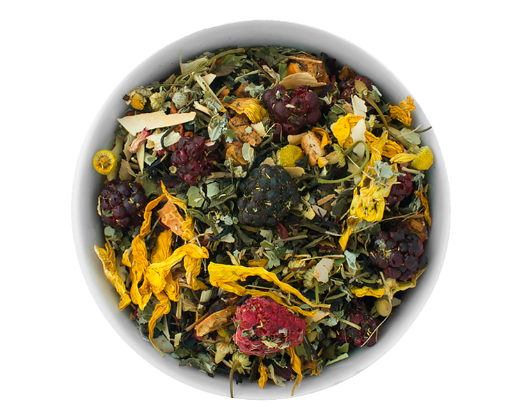 Ingrédients : Morceaux de pomme (pomme, acidifiant : acide citrique), fleurs d'hibiscus, feuilles de mûriers, feuilles de menthe poivrée (8%), écorces de haricots, fleurs de camomille, feuilles de framboisiers, arômes, fleurs de tournesol, mûres, framboises (0,5%).