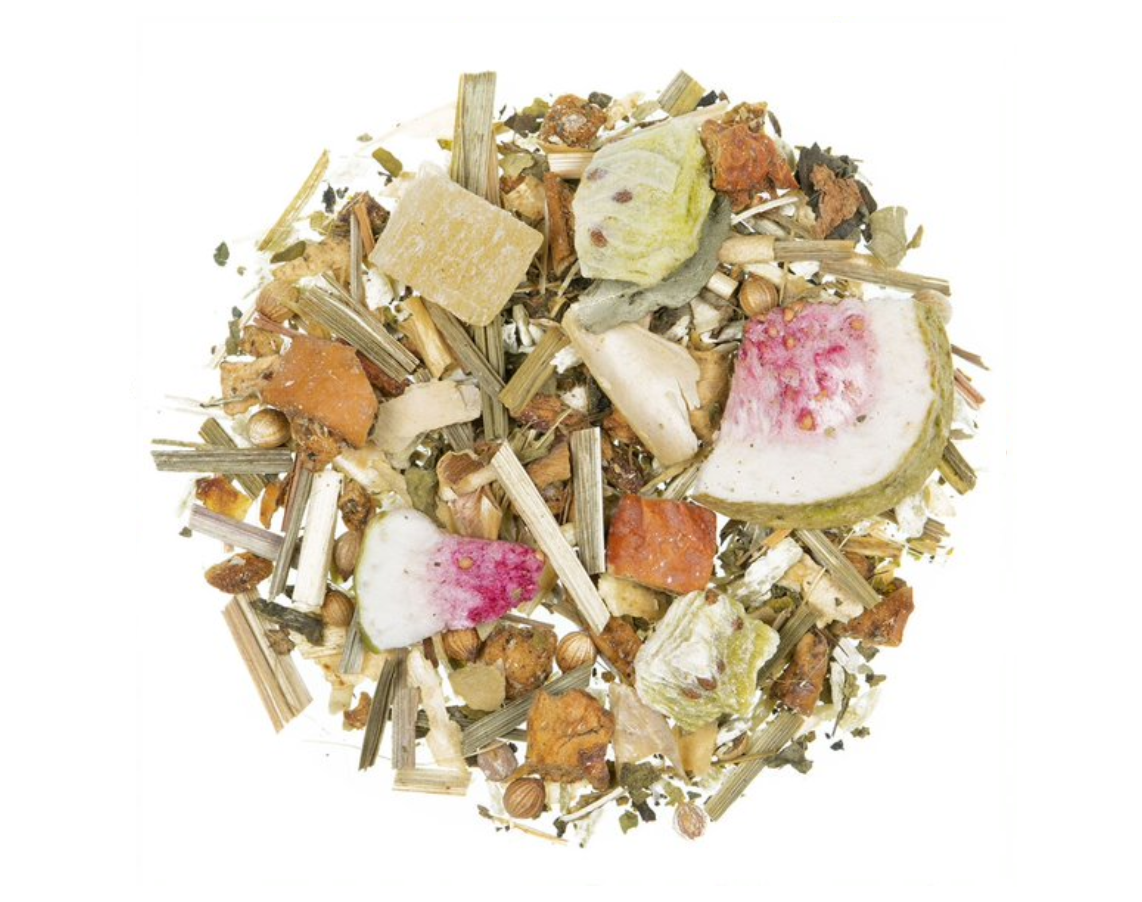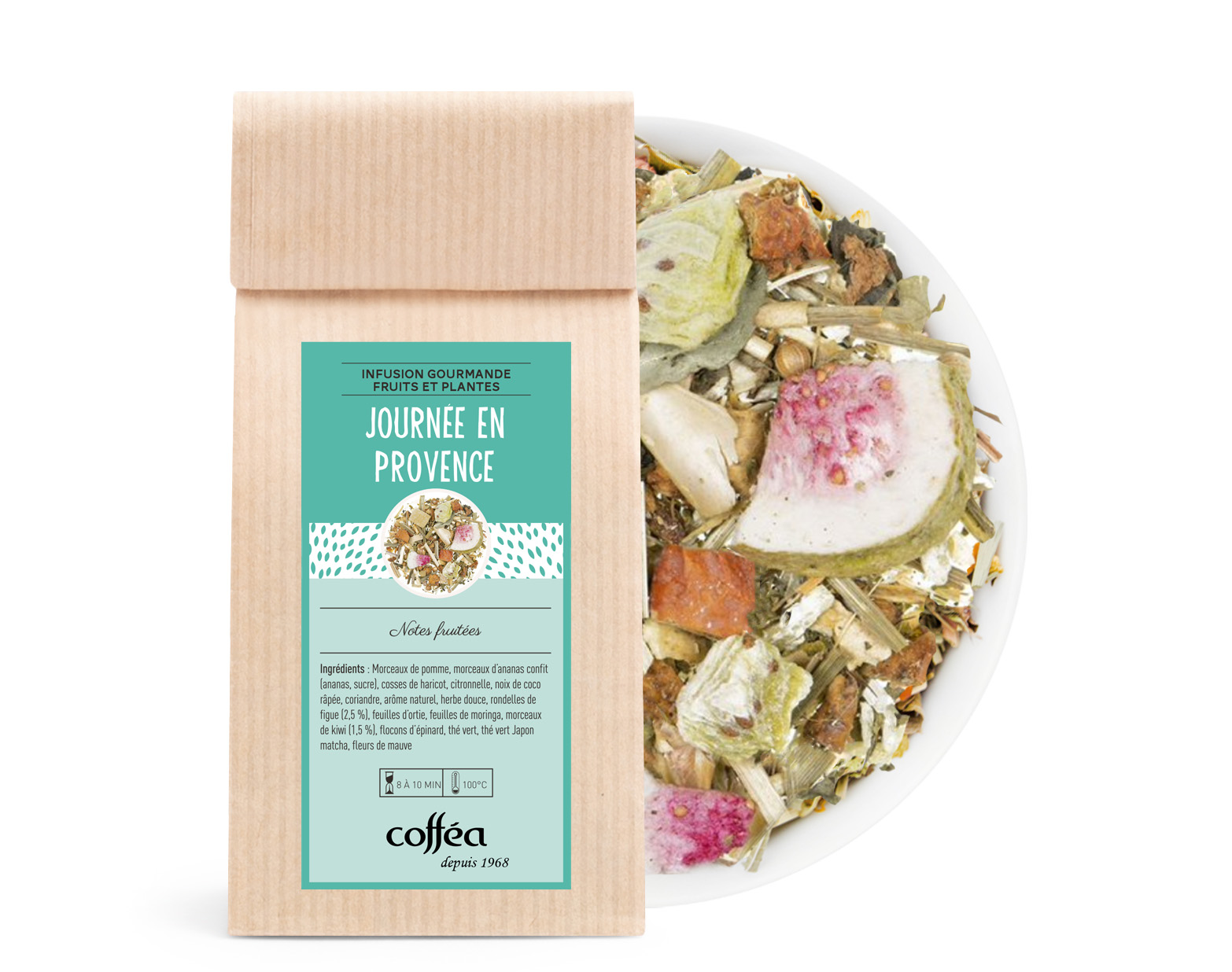 Ingrédients : Morceaux de pomme, morceaux d'ananas confit (ananas, sucre), cosses de haricot, citronnelle, noix de coco râpée, coriandre, arôme naturel, herbe douce, rondelles de figue (2,5 %), feuilles d'ortie, feuilles de moringa, morceaux de kiwi (1,5 %), flocons d'épinard, thé vert, thé vert Japon matcha, fleurs de mauve.