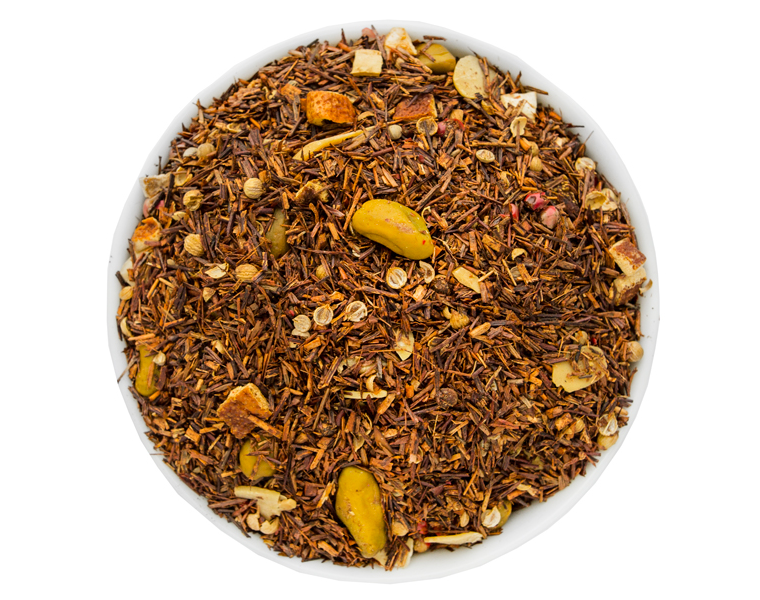 Ingrédients : Rooibos, morceaux d’amande, pistache, écorces d’orange (5 %), coriandre, arômes (orange et autres arômes), poivre rose
