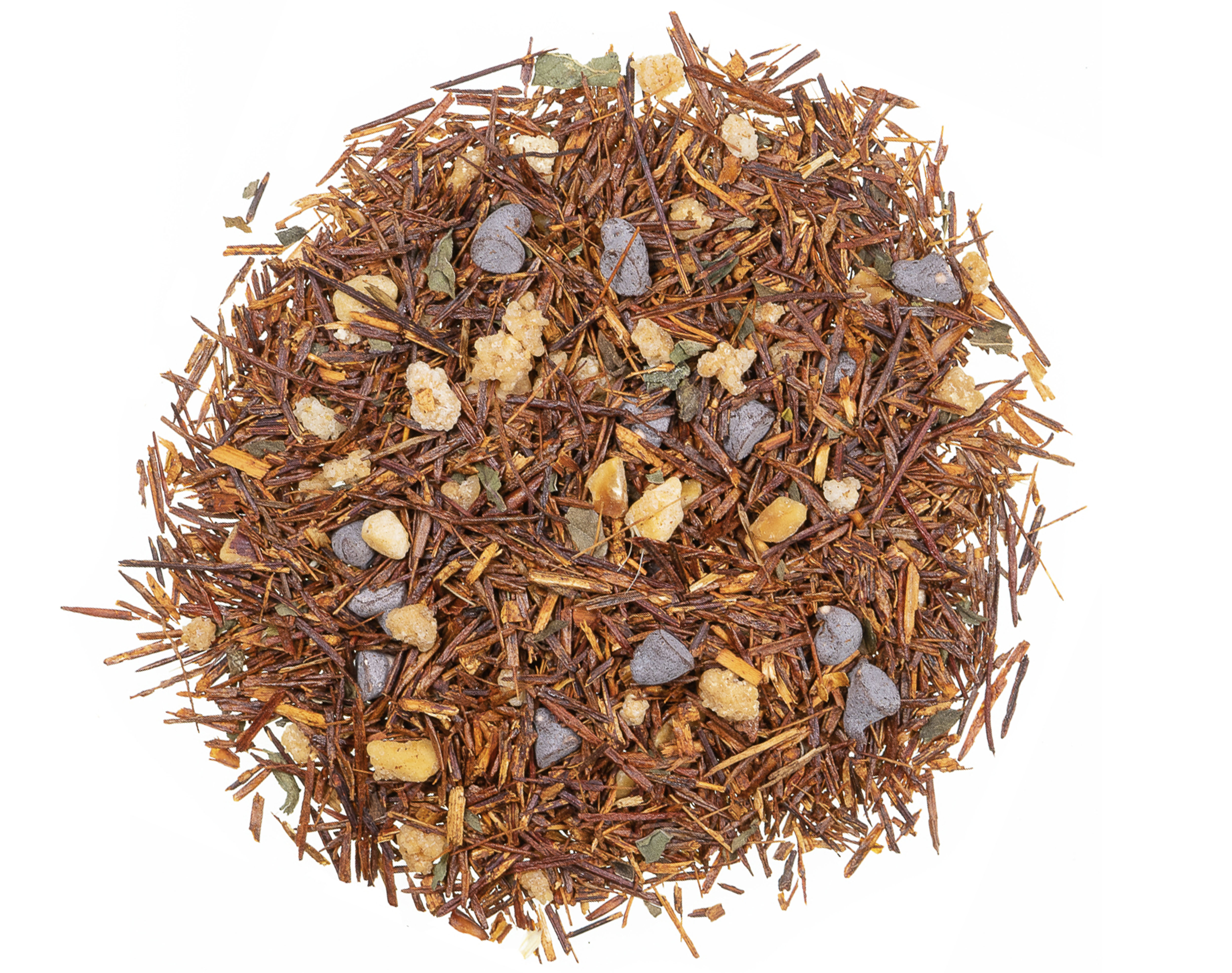 Ingrédients : Rooibos, morceaux de nougatine (sucre, noisettes), morceaux de chocolat (sucre, pâte de cacao, cacao maigre en poudre, beurre de cacao, dextrose, émulsifiant : lécithine de tournesol) (7 %), arômes, feuilles de menthe (3 %)