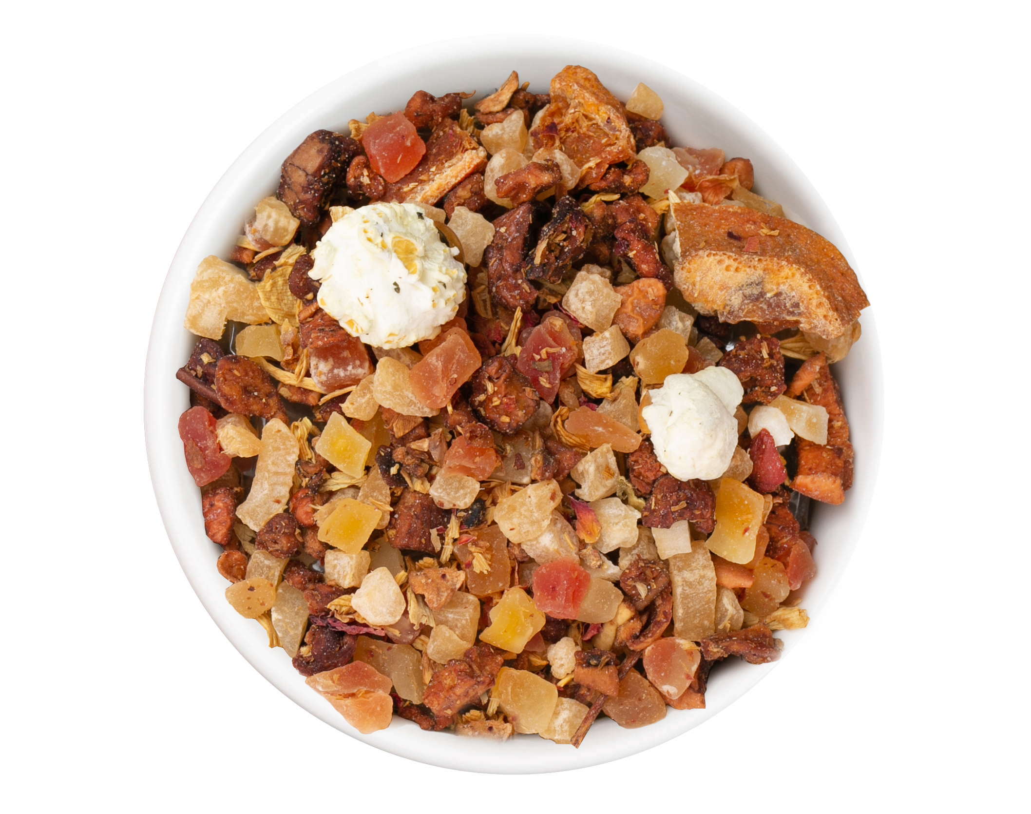 L'Infusion Vanille Éclatante combine des notes douces et exquises de vanille, de noisettes et de noix de coco pour une expérience gustative à la fois gourmande et réconfortante. Le galanga, une variété de gingembre, et les morceaux de vanille apportent une touche épicée et aphrodisiaque à cette infusion. Les morceaux de pomme et le riz soufflé équilibrent parfaitement les saveurs, offrant une infusion douce et légèrement sucrée, idéale pour éveiller les sens.