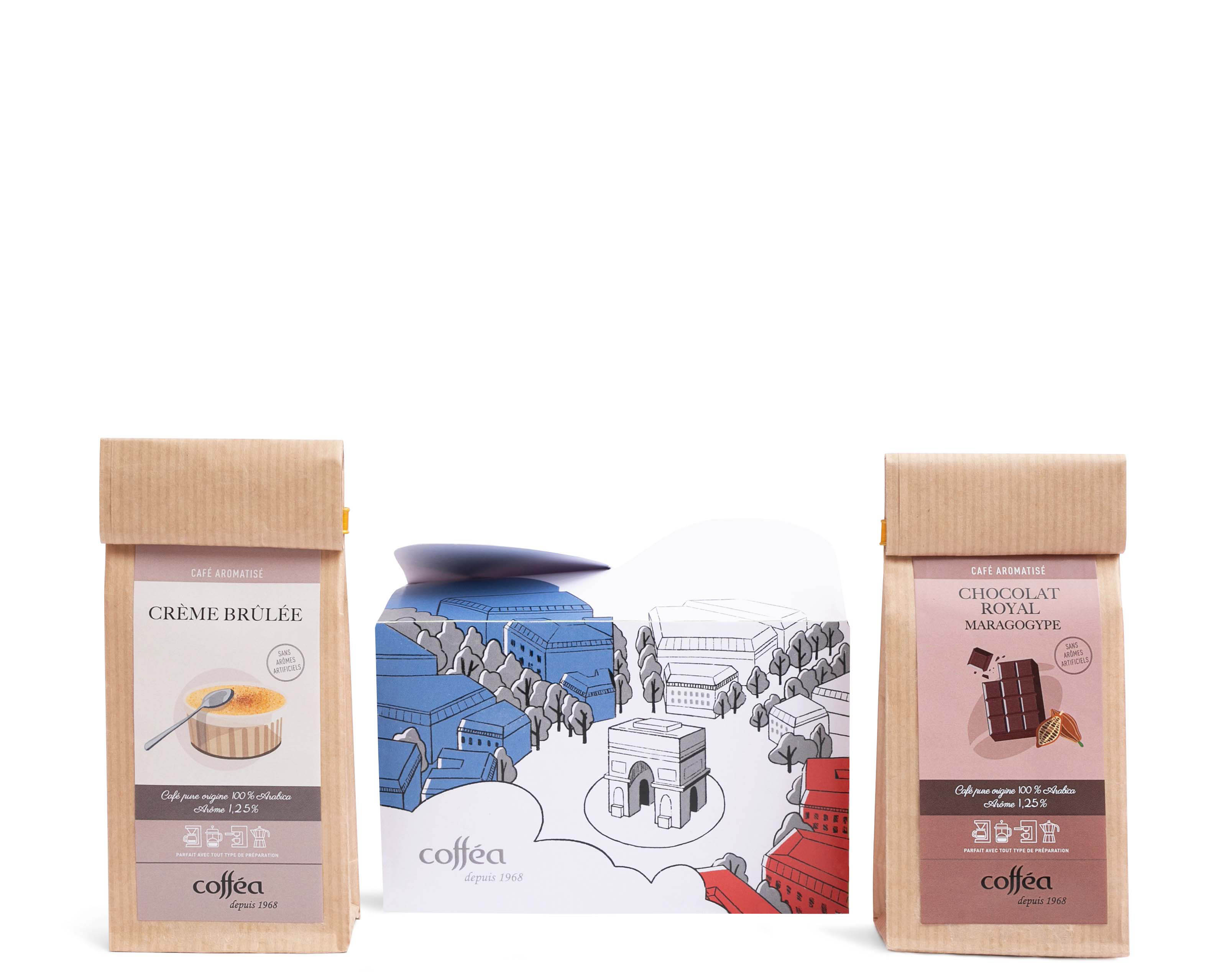 Ce coffret contient deux variétés de cafés aromatisés aux notes de chocolat et de crème brûlée. Combinaison parfaite pour faire plaisir à vos proches et un vrai régal qui ne laisse personne indifférent. A savourer !