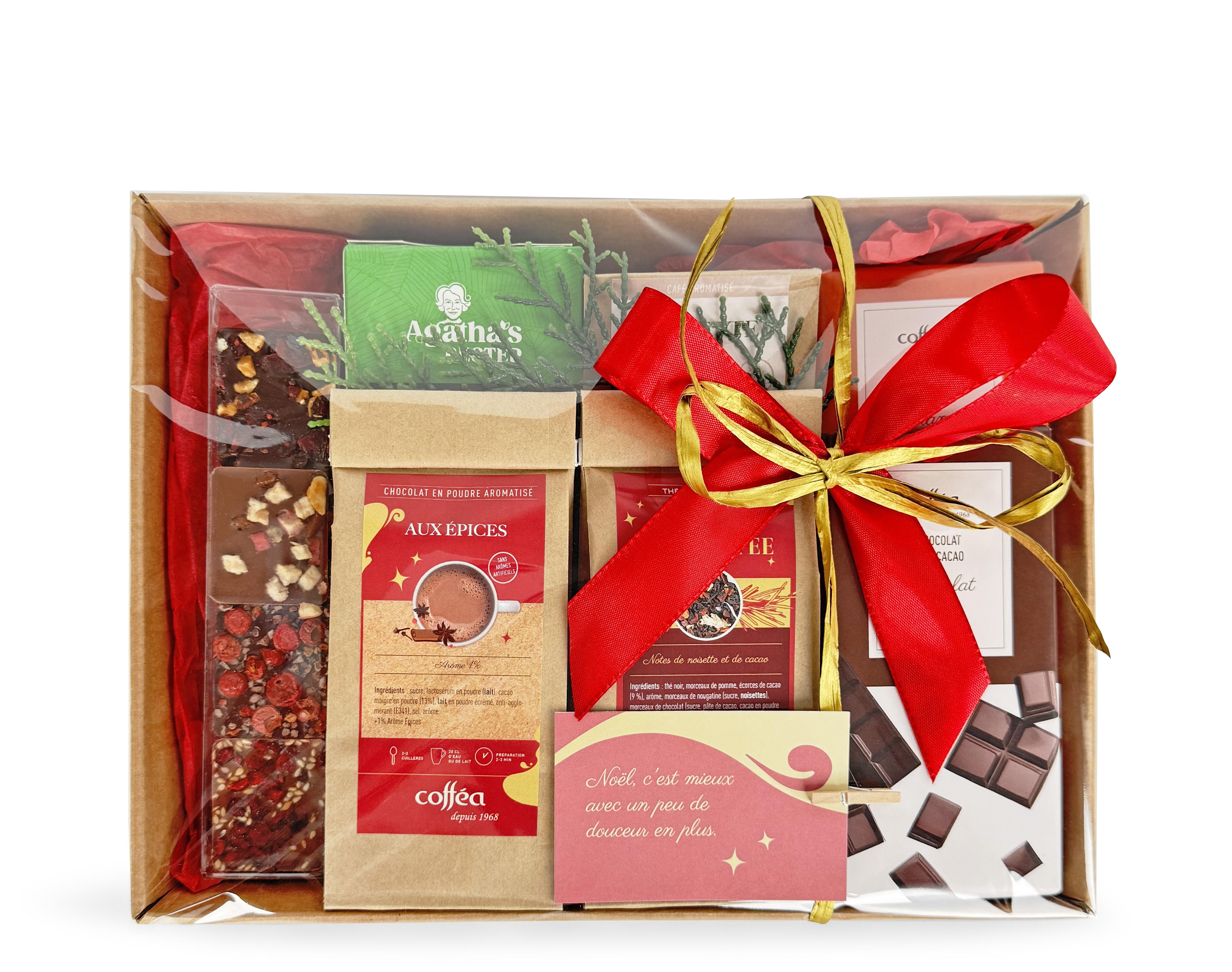 On y trouve un thé vert Noel au cottage aux accents gourmands, un café à la noisette aux arômes veloutés et un chocolat chaud aux épices délicatement réconfortant. Carrés et tablettes de chocolat complètent ce coffret enchanteur, promesse d’un instant chaleureux et plein de charme hivernal.