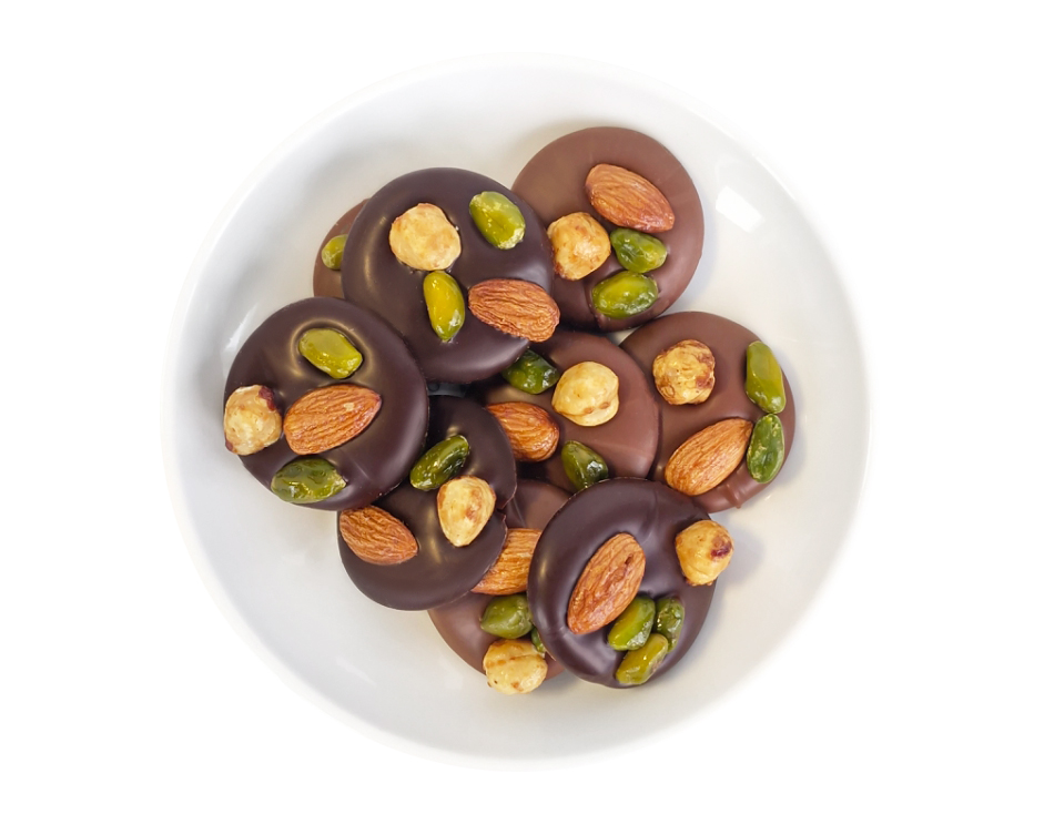 Les mendiants sont des chocolats ronds traditionnels garnis de manière harmonieuse avec un assortiment de fruits secs (amandes, noisettes, pistaches) et fruits confits (écorces d’orange, cerises). Le chocolat utilisé est généralement noir ou au lait, offrant un équilibre parfait entre douceur et intensité. Produit artisanal, respectant les traditions de fabrication, idéal pour les moments de dégustation raffinée.