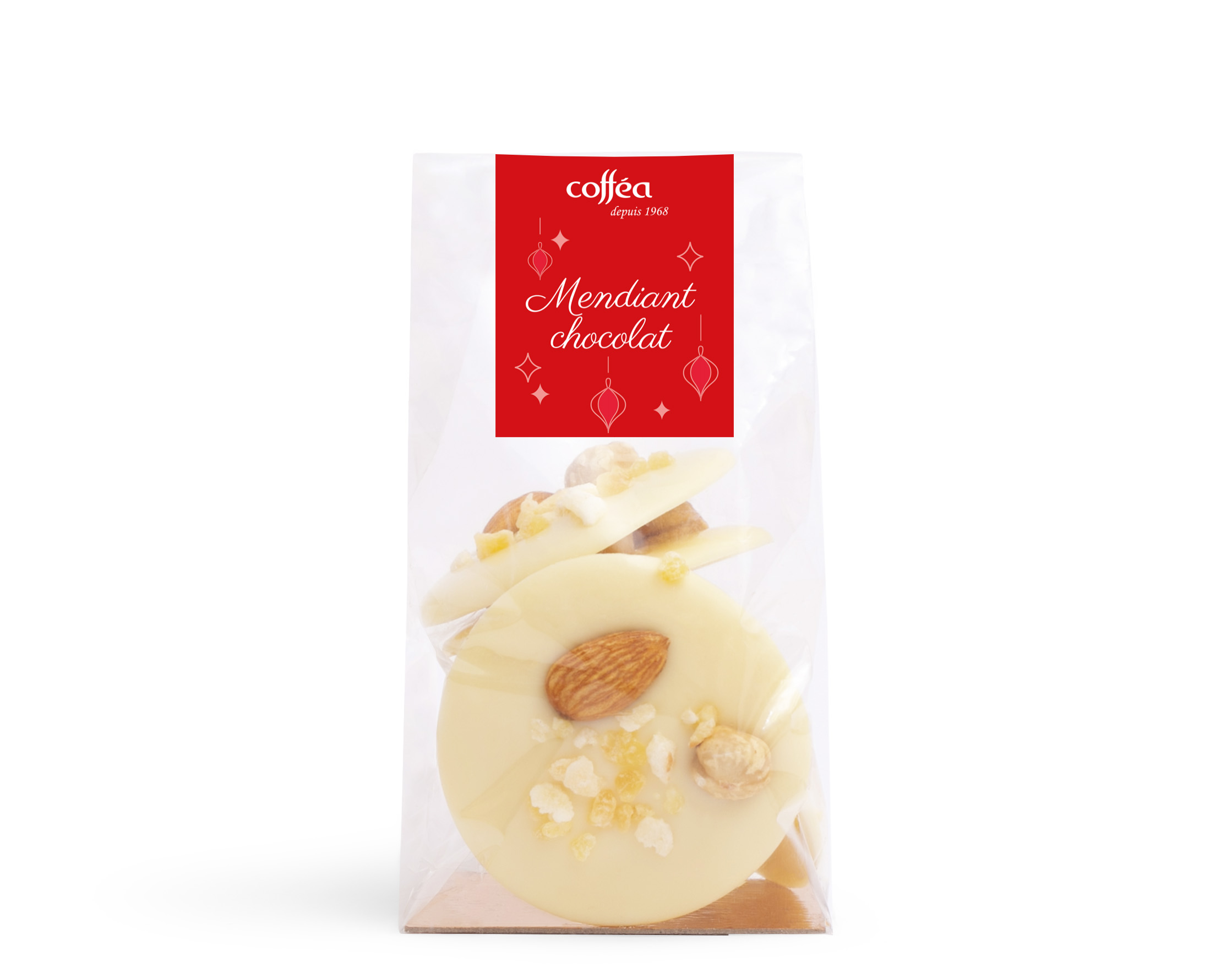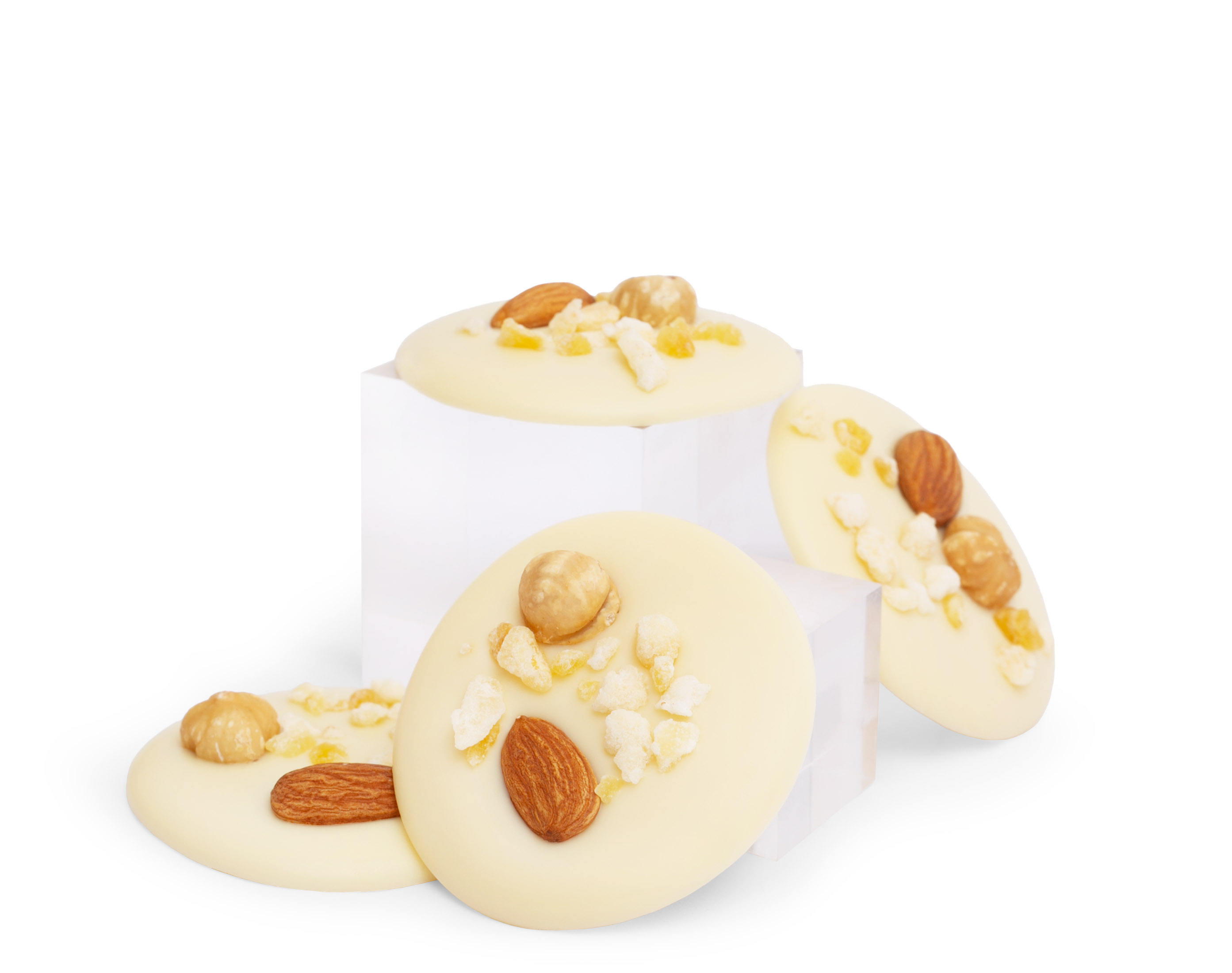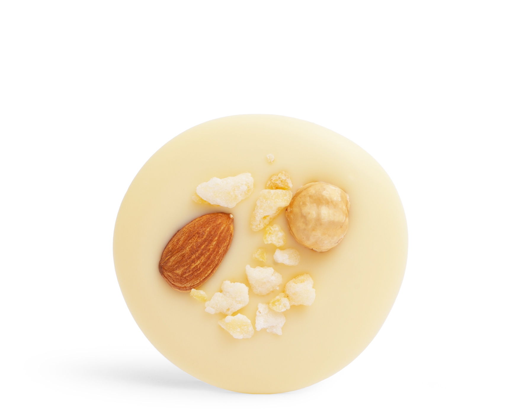 Ingrédients: chocolat blanc (sucre, beurre de cacao, poudre de LAIT entier, arôme naturel de vanille, émulsifiant lécithine de SOJA), décor: pistaches, fraises et mures séchées.