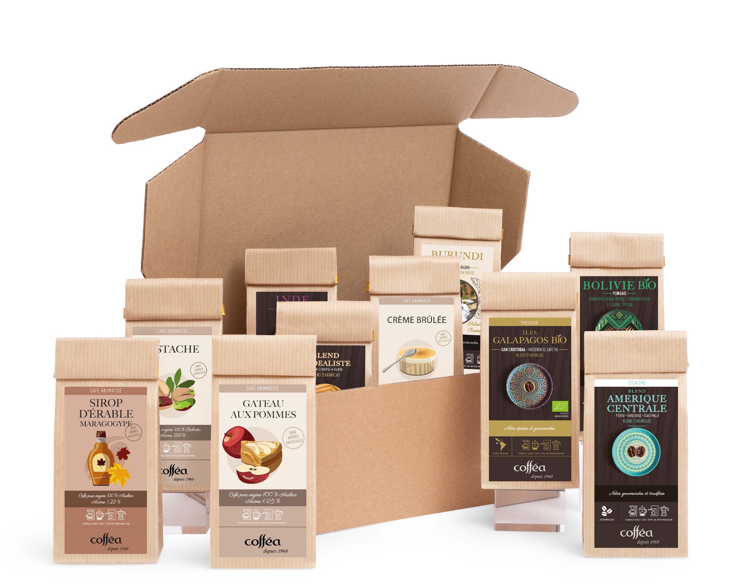 Un mélange de dix types de café. Les notes classiques sont remplacées par des notes de dessert et l'on comprend immédiatement que l'on est en présence d'une véritable boîte à saveurs. Du café pour le matin, l'après-midi et le soir. Un cadeau pour vos proches ou pour vos collègues. Ce coffret vous sera toujours utile ! Vous trouverez plus de détails dans le descriptif ci-dessous !
