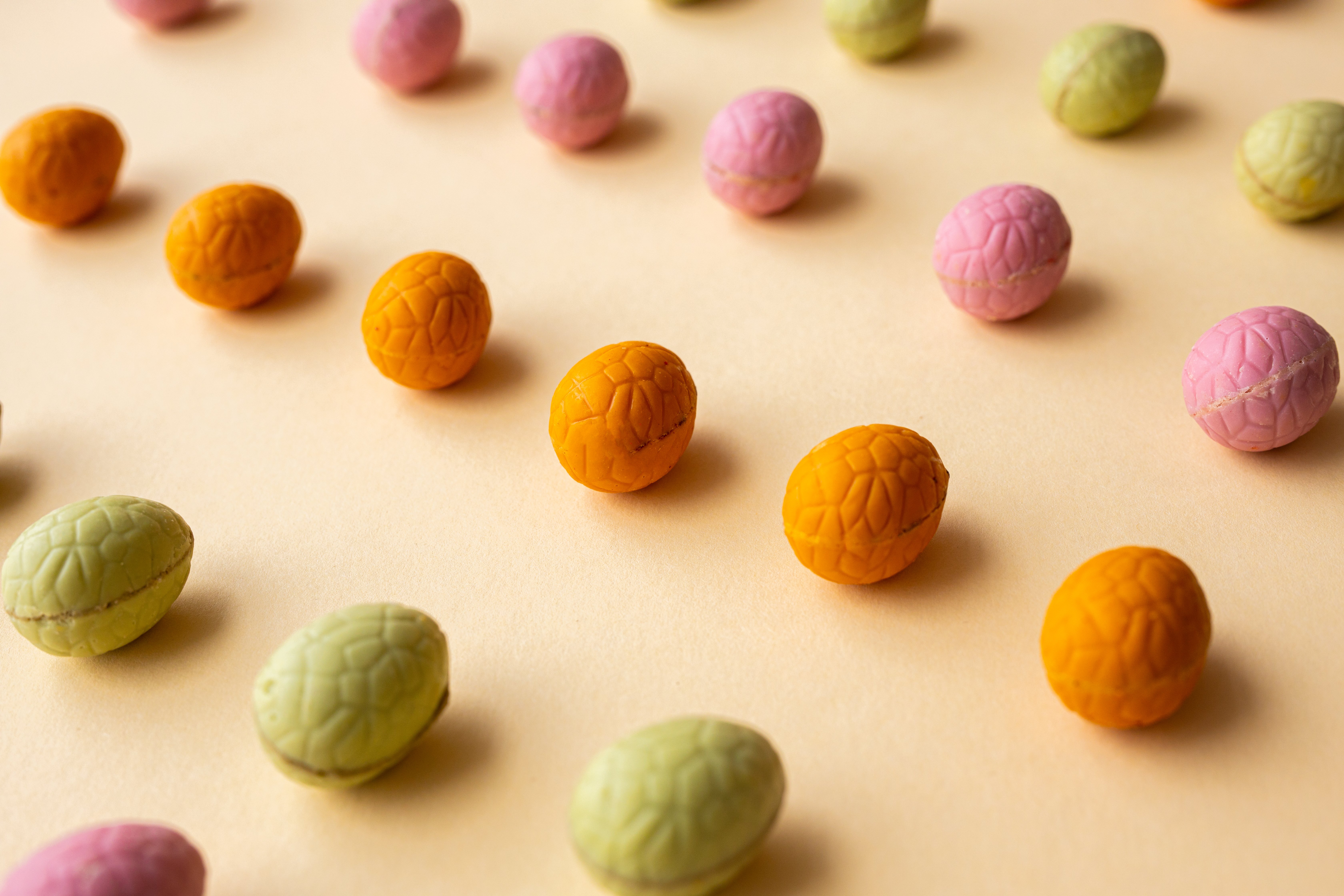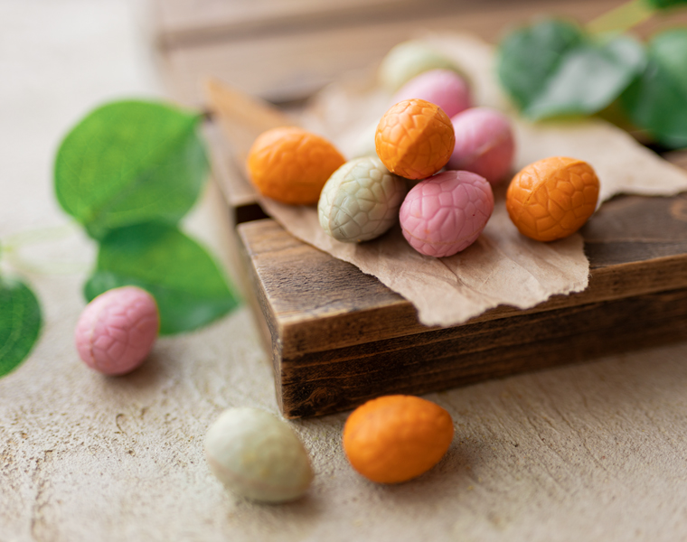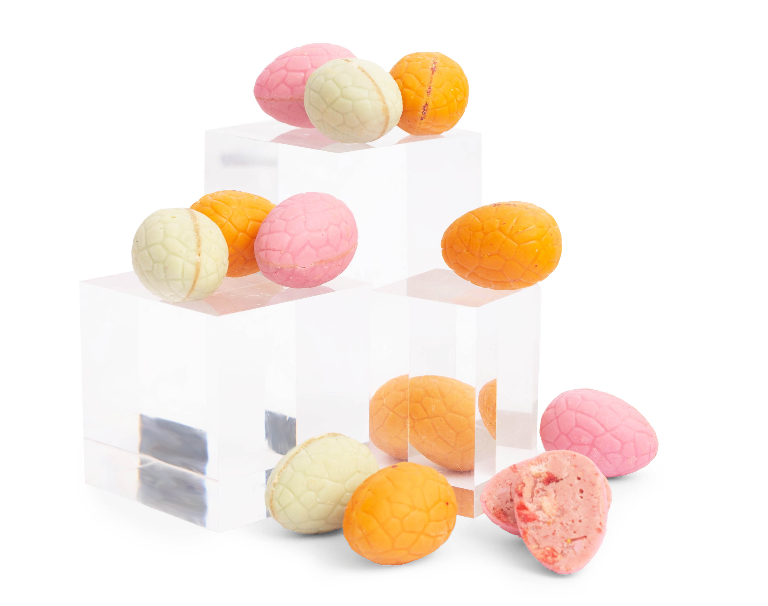 Oeuf à l'orange : Chocolat Blanc 55,9% (Sucre, Beurre de Cacao, Lait Entier en Poudre, Emulsifiant : Lécithine de Soja, Arôme Naturel : Vanille), Chocolat Blanc Aromatisé à l'Orange 20,9% (Sucre, Beurre de Cacao, Lait Entier en Poudre, émulsifiant : lécithine de Soja ; naturel arôme : orange, colorant : carotène aldéhyde ; arôme naturel : vanille), beurre de noix d'amande 20,3%, cerise lyophilisée 2,9%.