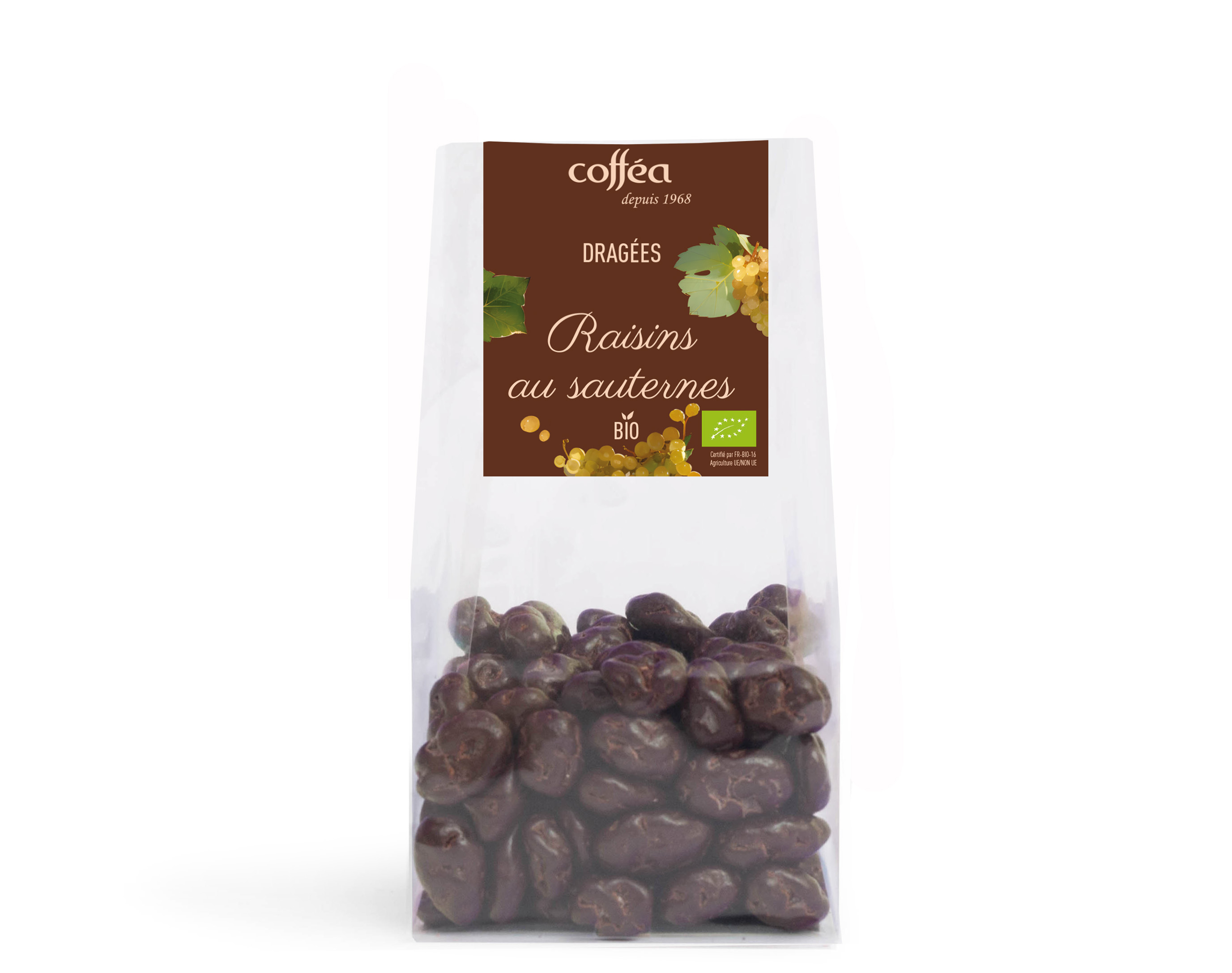Ingrédients : Raisin macéré au vin blanc doux Sauternes et enrobé de chocolat noir aromatisé pêche. Chocolat noir* 44% (cacao 74% min) (masse de cacao*, sucre*, beurre de cacao*, vanille en poudre*), raisin sec* 44% (raisin sultanine*, huile de tournesol*), sucre glace* (sucre de canne*, tapioca*), sucre*, vin blanc doux Sauternes* 2%, arôme naturel de pêche*, amidon de riz*, agent d’enrobage* (gomme d’acacia*, saccharose*, miel*). (*Produit issu de l’agriculture biologique)