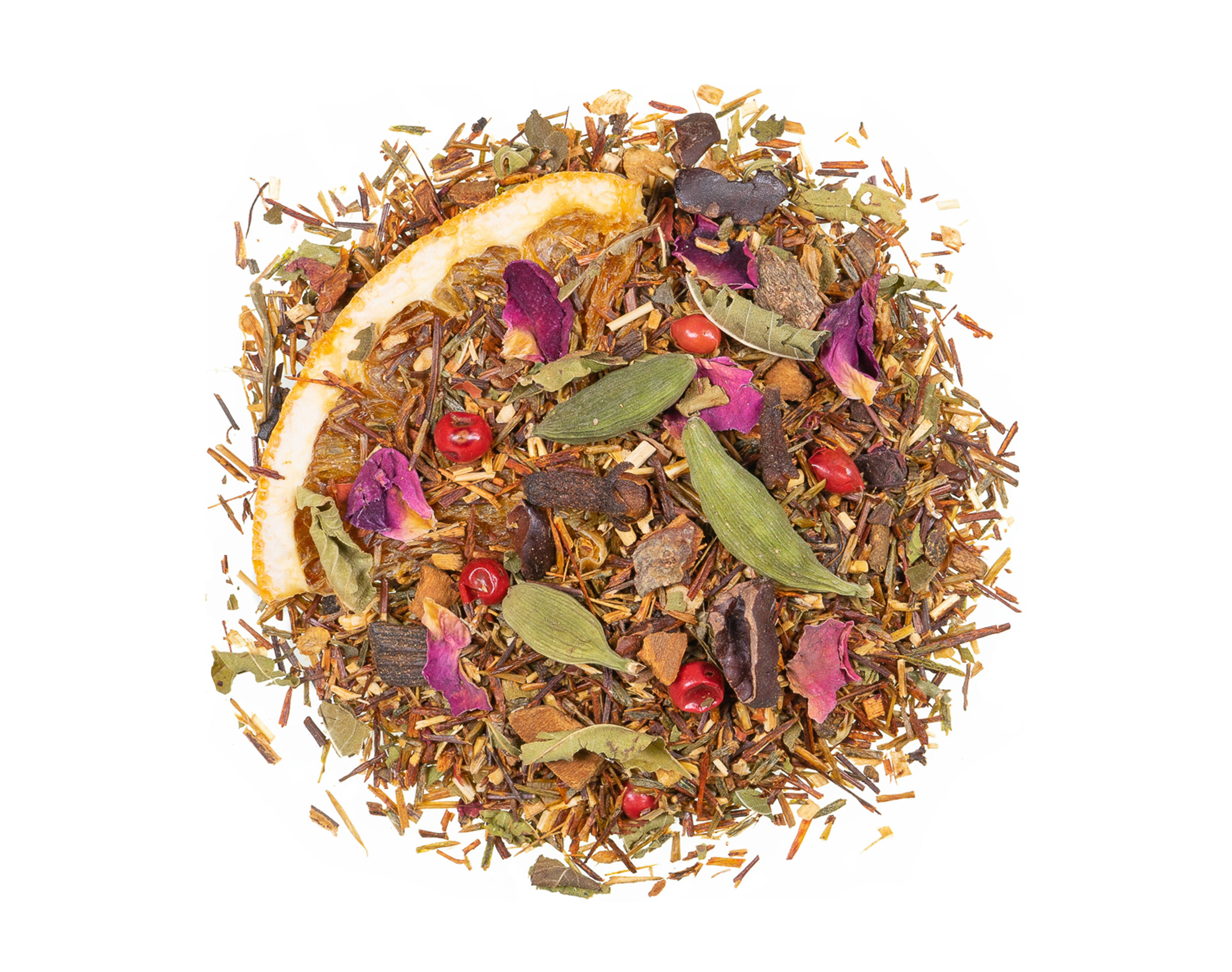 Composition : Honeybush vert, morceaux d’orange (8 %), morceaux de cacao, cannelle, gingembre, verveine, cardamome, clous de girofle, poivre rose, feuilles de rose, morceaux de vanille (1 %), arôme.