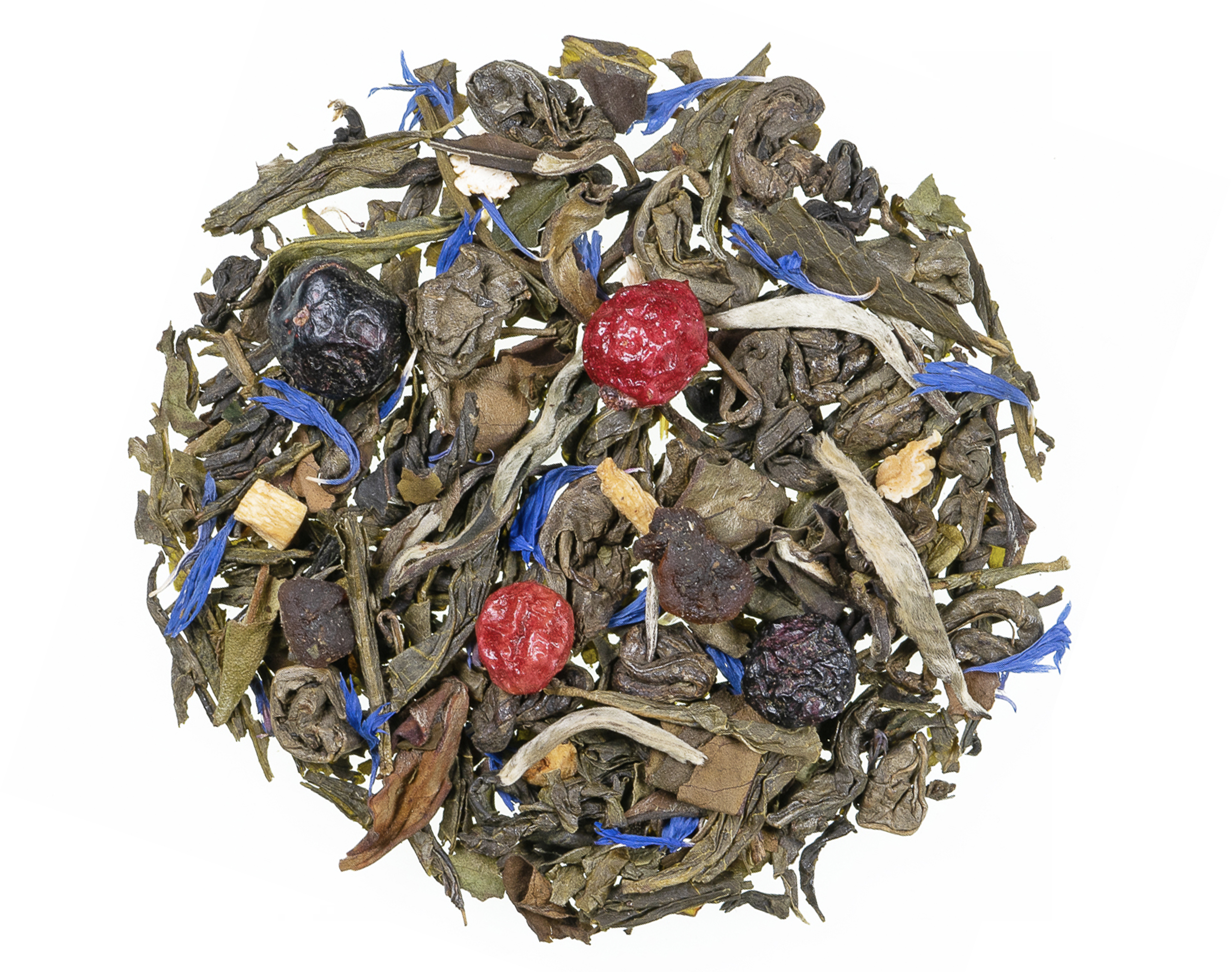 Ingrédients : Thé vert de Chine Sencha, thé vert Ming Mee, thé blanc Pai Mu Tan, thé vert Gunpowder, thé vert Wu Lu Fog, arômes, groseilles, cassis, racine de ginseng, fleurs de bleuet, morceaux d'abricot (abricot, farine de riz) (1%).