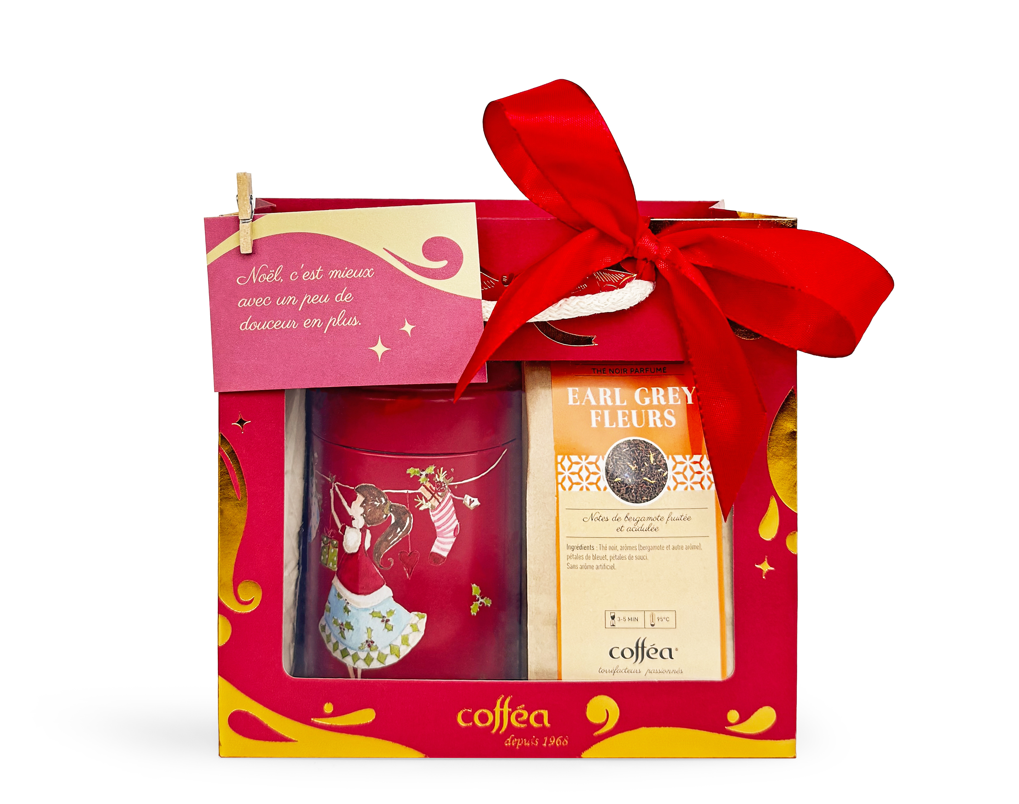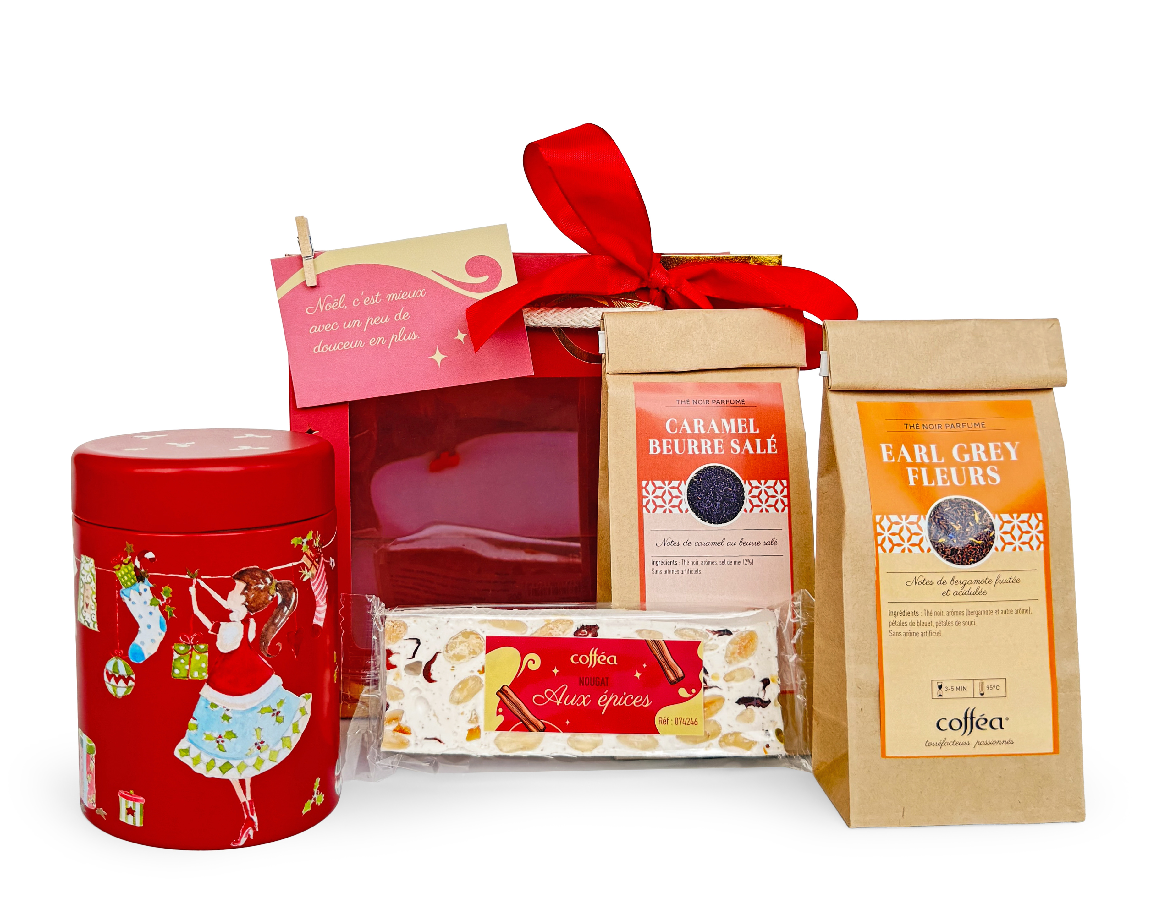 Sous un ciel parsemé d’étoiles, Saveurs étoilées invite à un voyage gourmand et raffiné. Le thé noir Earl Grey aux fleurs s’accorde avec la douceur du caramel au beurre salé, tandis que la barre de nougat aux épices révèle toute la chaleur des fêtes.