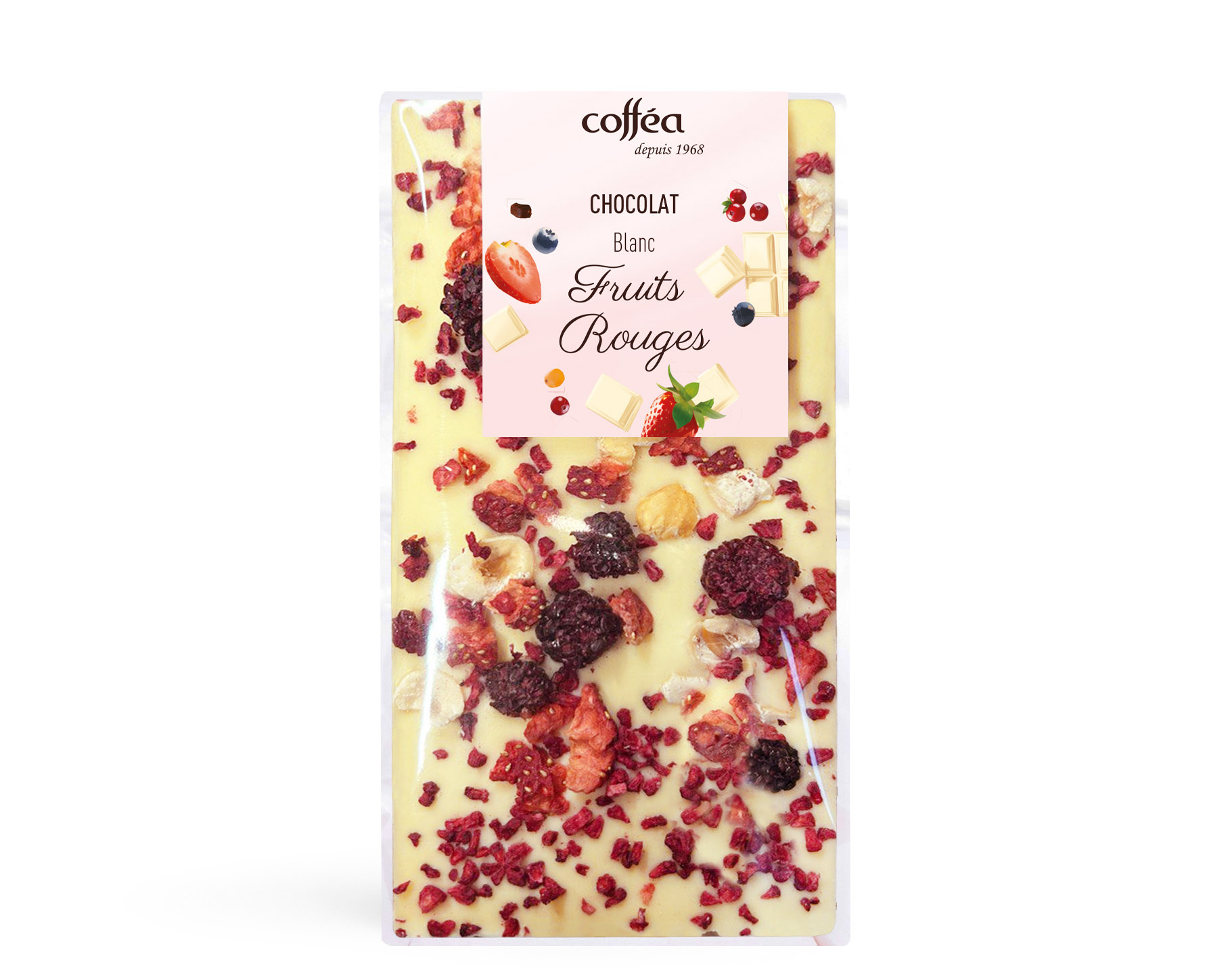 Ingrédients : sucre, beurre de cacao, poudre de LAIT entier, NOISETTES, inclusion de fruits (fraises, mures, framboises séchées), émulsifiant : lécithine de SOJA, arôme naturel de vanille.