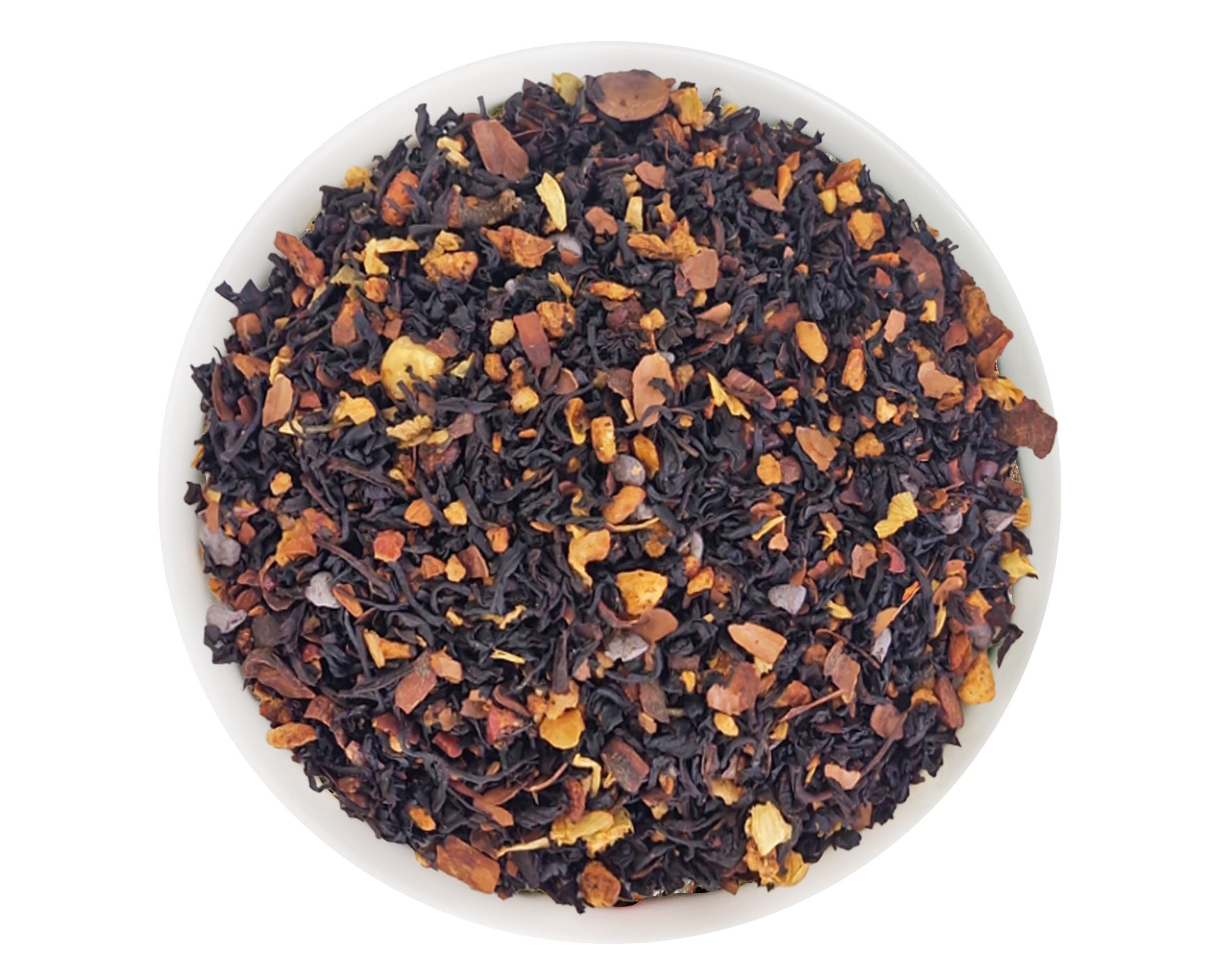Thé noir riche, idéal pour l’hiver. Les notes de cacao et de noisette dominent, évoquant la bûche de Noël au chocolat praliné. La pomme et l’hibiscus apportent juste ce qu’il faut de fraîcheur et de légèreté. Le chocolat est bien intégré, sans excès sucré.