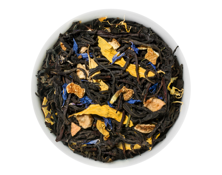 Mélange de thé noir (78 %), morceaux de pomme, écorces d’agrumes, herbe d’orge, pétales de tournesol, pétales de bleuet, arôme naturel.