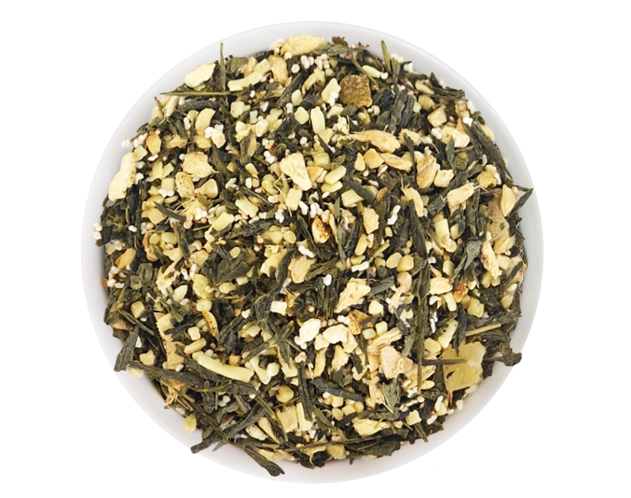 Composition : Thé vert (31 %), gingembre (24 %), éclats de beurre de cacao blanc, amandes hachées, morceaux de gingembre confit (10 %), écorces d'agrumes, arôme naturel, fleurs d’amarante.