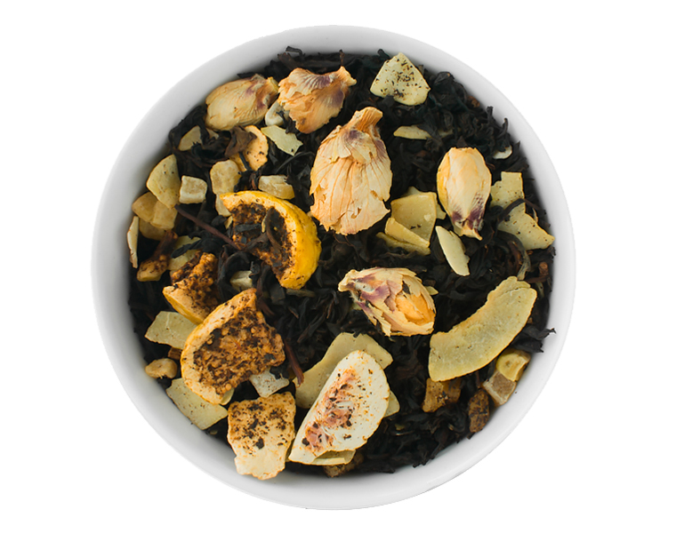 Ingrédients : Thé noir, mangue confite, chips de noix de coco, chips d'ananas, arôme naturel, morceaux de figues, fleurs d'hibiscus blanc.