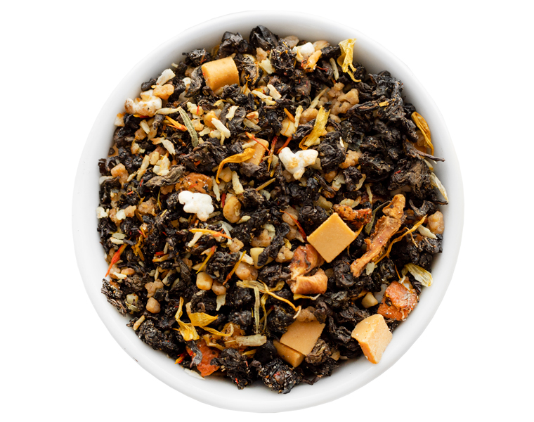 Ingrédients : Thé oolong, morceaux de nougatine (sucre, noisettes), morceaux de caramel (sucre, beurre de cacao, caramel en poudre (lait écrémé en poudre, poudre de lactosérum, sucre, beurre, arôme naturel), lait entier en poudre, émulsifiant : lécithine de tournesol, extrait de paprika)(12 %), arôme, noix de coco râpée, morceaux de pomme, sel de la mer (3%), fleurs de souci, riz soufflé, pétales de tournesol.