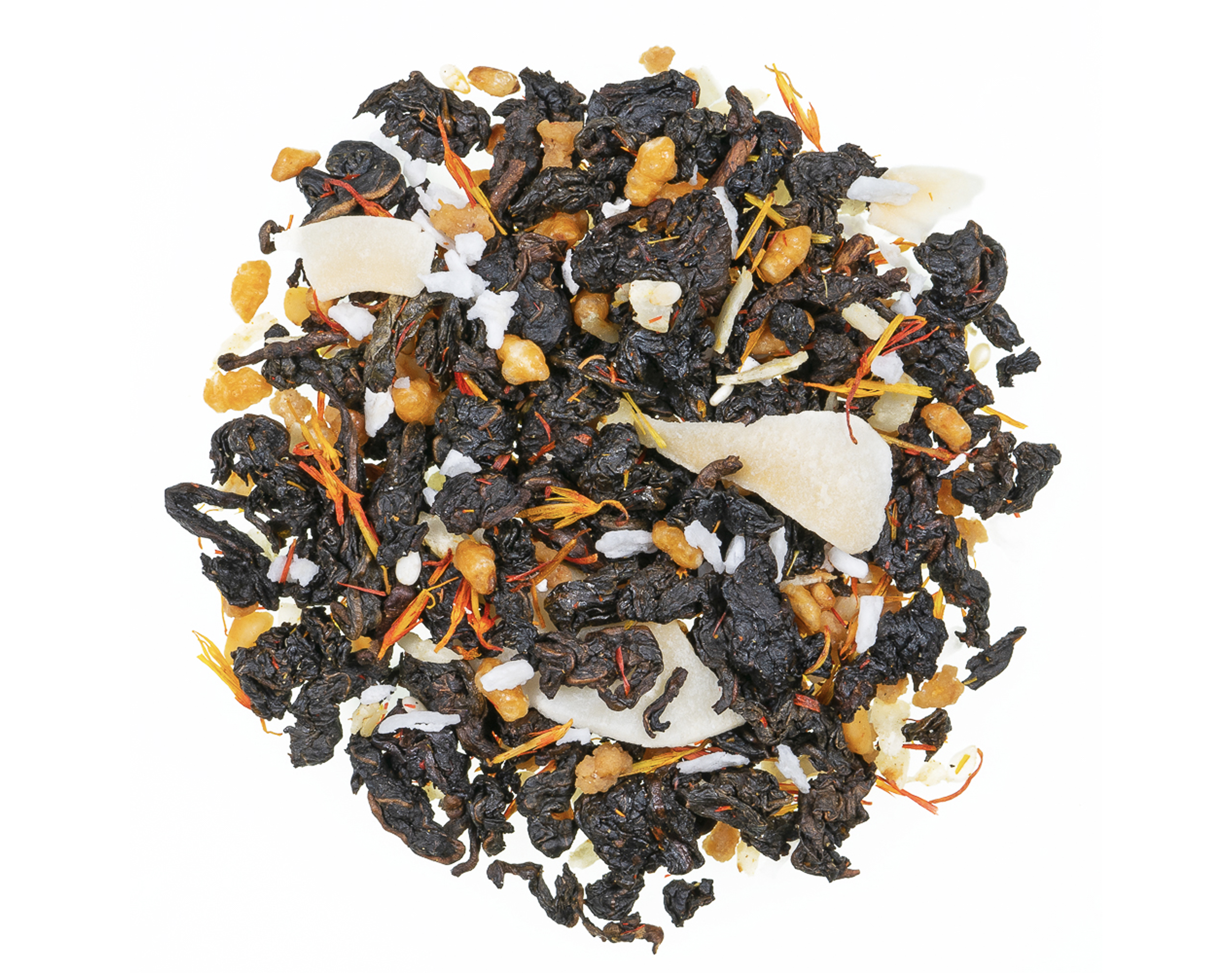 Ingrédients : Oolong, noisette caramélisée, caramel, arôme, copeaux de noix de coco, morceaux de pommes, sel de mer, calendula, riz frit, carthame.