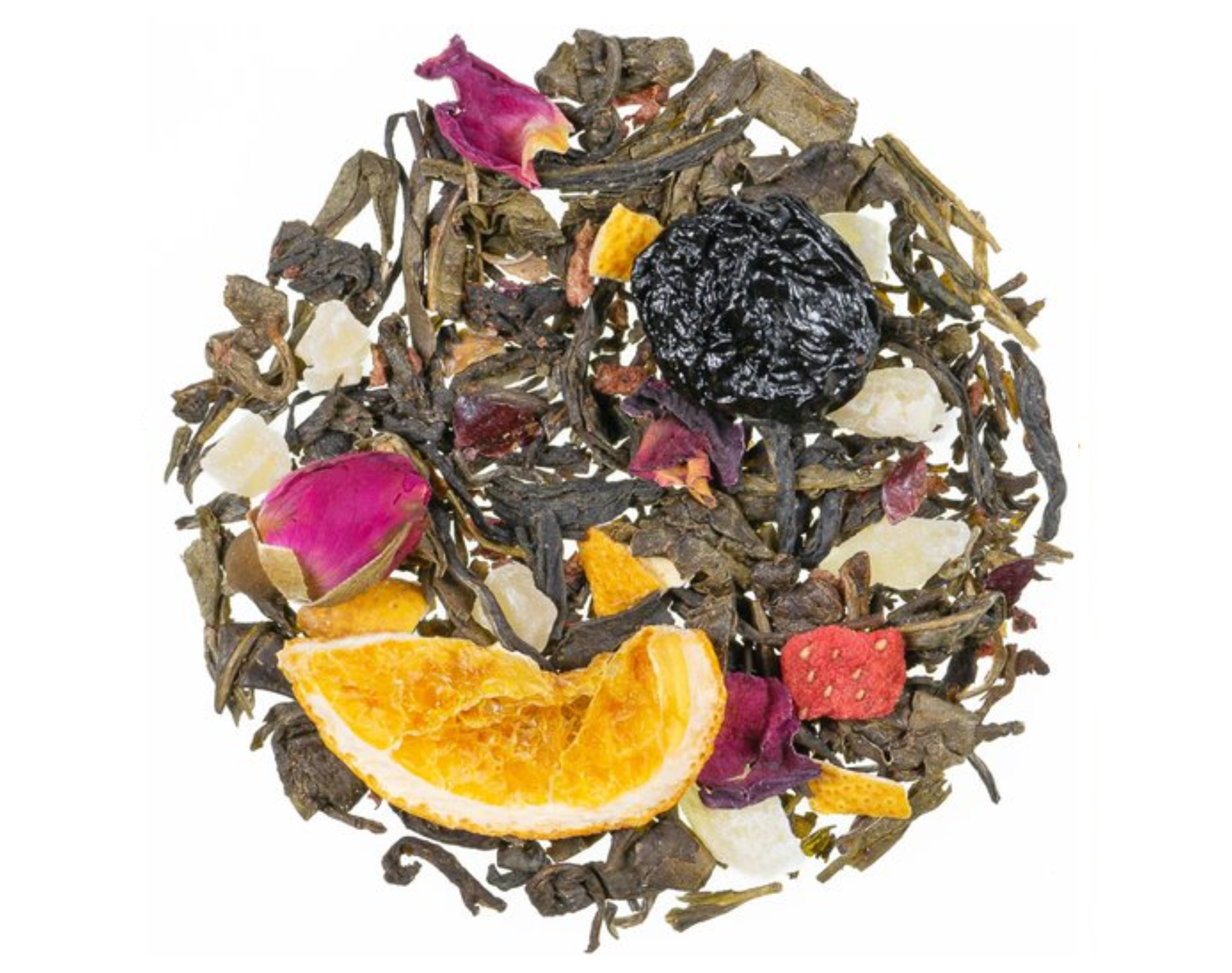 Ingrédients : Thé blanc de Chine Mao Feng, thé vert de Chine Sencha, morceaux d’ananas confit (ananas, sucre), morceaux de mangue confite (mangue, sucre), cerises, arôme, morceaux d’orange (6 %), thé vert de Chine Gunpowder, écorces de citron, morceaux de canneberge, boutons de rose, morceaux de fraise (1 %), pétales de rose.