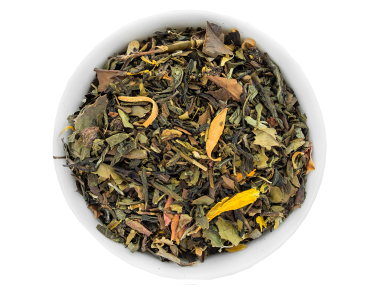 Ingrédients : Thé blanc de Chine Paï Mu Tan, thé vert Wu Lu Fog, thé vert Lung Ching, thé vert Perles de Jasmin, morceaux d'abricot (abricots, farine de riz), arômes, pétales de rose, morceaux de griottes, fleurs d'oranger, pétales de tournesol.