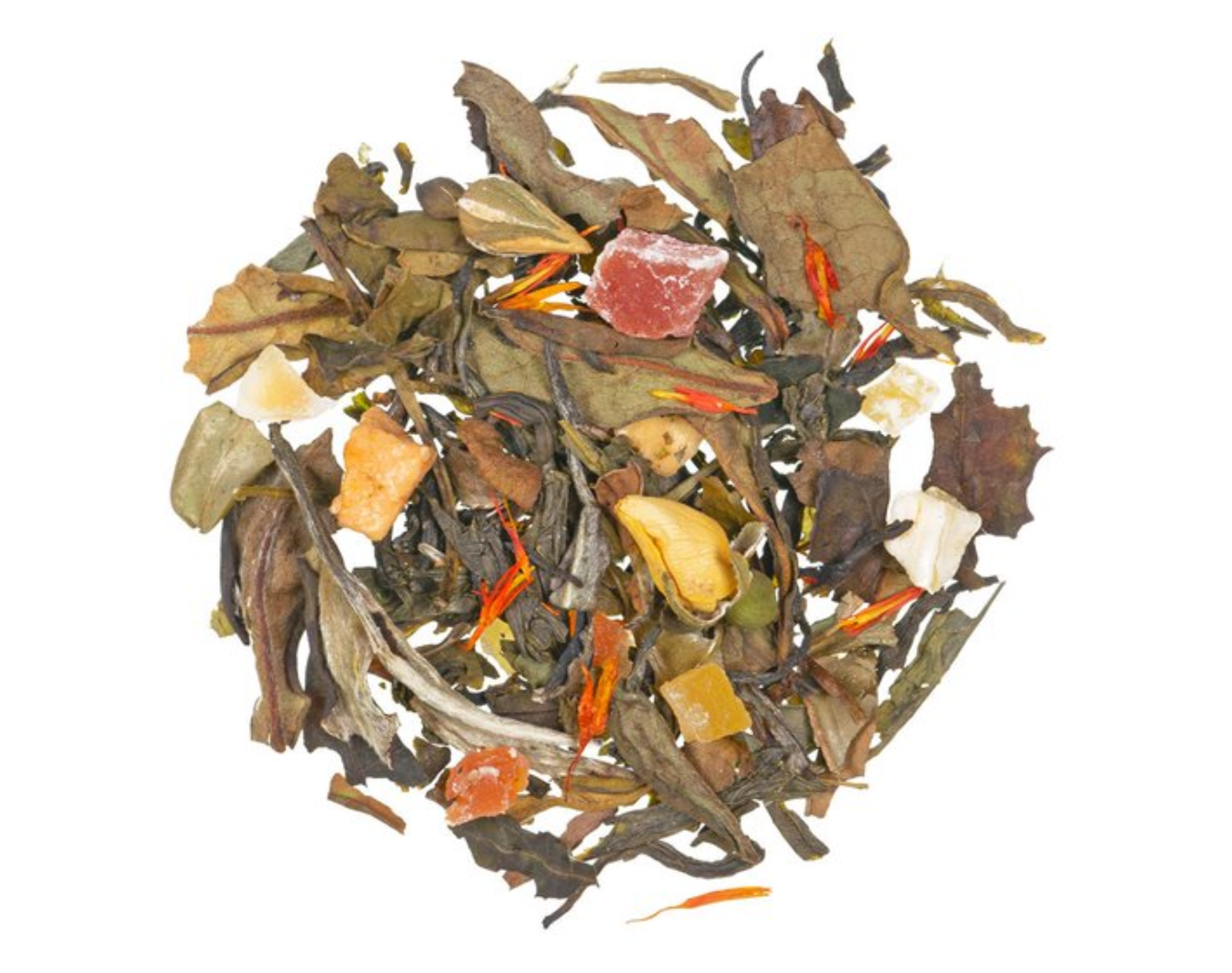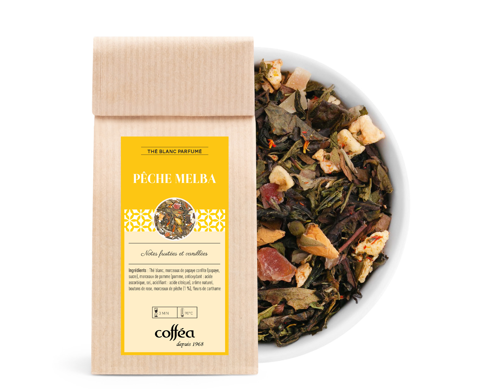Ingrédients : Thé blanc, morceaux de papaye confite (papaye, sucre), morceaux de pomme (pomme, antioxydant : acide ascorbique, sel, acidifiant : acide citrique), arôme naturel, boutons de rose, morceaux de pêche (1 %), fleurs de carthame.