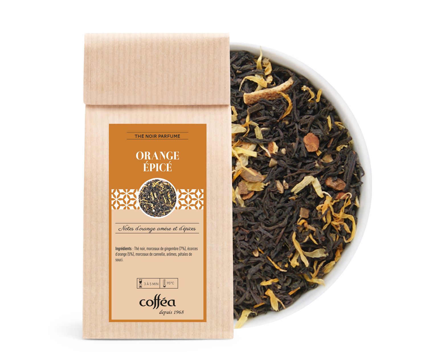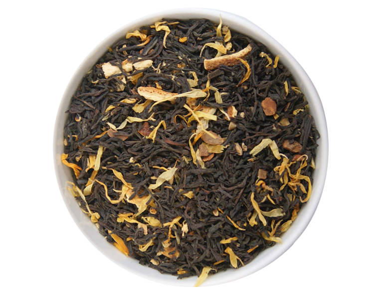 Thé noir, écorces d’orange, morceaux de gingembre, morceaux de cannelle, arômes, pétales de souci.