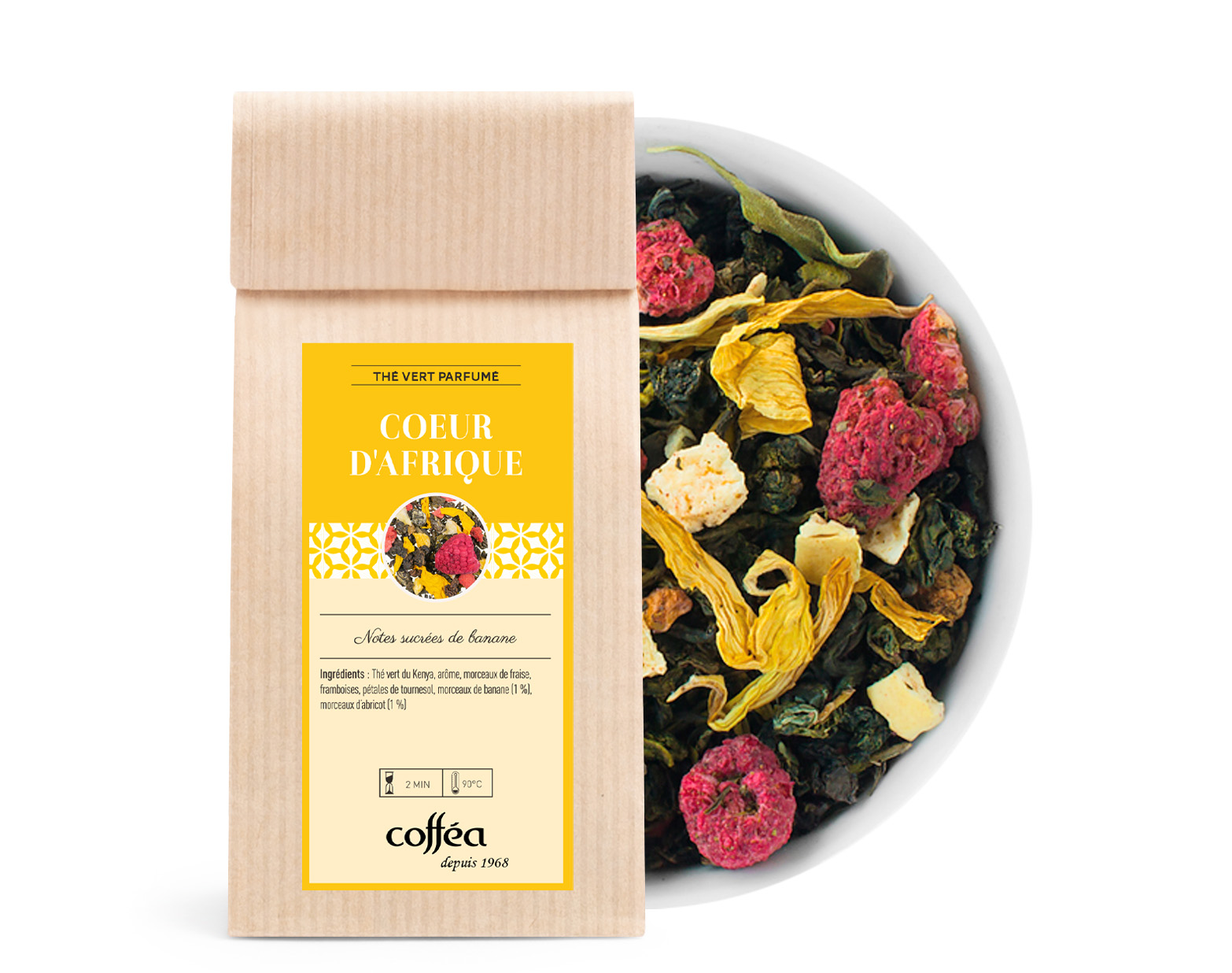 Le Thé vert Cœur d'Afrique combine la puissance du thé vert du Kenya avec la douceur des fruits tropicaux. Il offre une infusion vive et fruitée avec des arômes naturels de fraise, banane et abricot, rehaussés par les pétales de tournesol et la framboise entière. Ce mélange est non seulement délicieux chaud mais également parfait pour une boisson rafraîchissante en été. En infusion chaude, il peut être agrémenté de miel et de poivre pour une touche réconfortante. En version froide, avec des glaçons et un peu de sirop de grenadine, il se transforme en un cocktail estival idéal.
