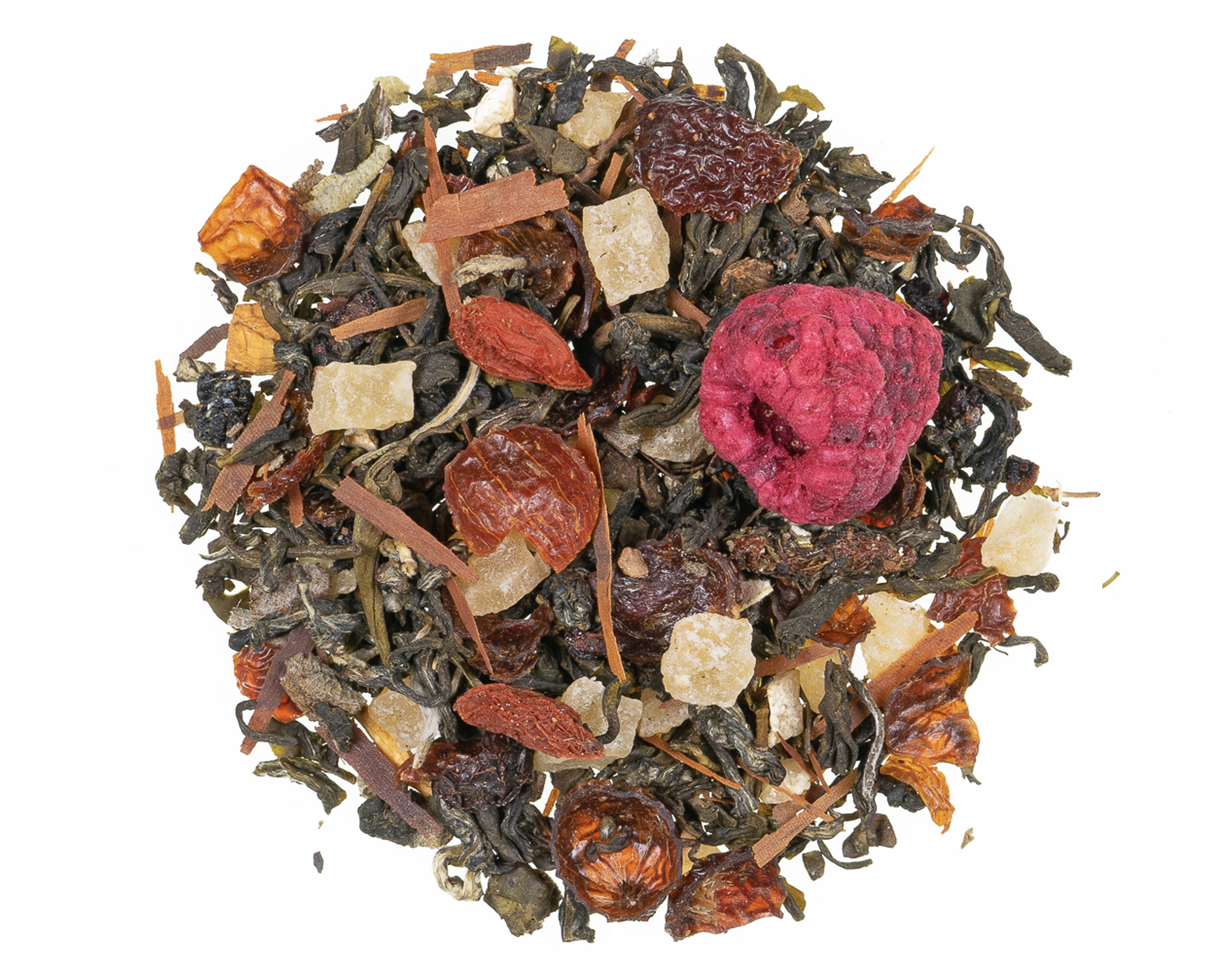 Ingrédients : Thé vert, morceaux d'ananas confits (ananas, sucre), cynorhodon, arômes naturels, feuilles de sauge, lapacho, baies de sureau, baies de goji (3%), framboises, racine de ginseng (0,5%).