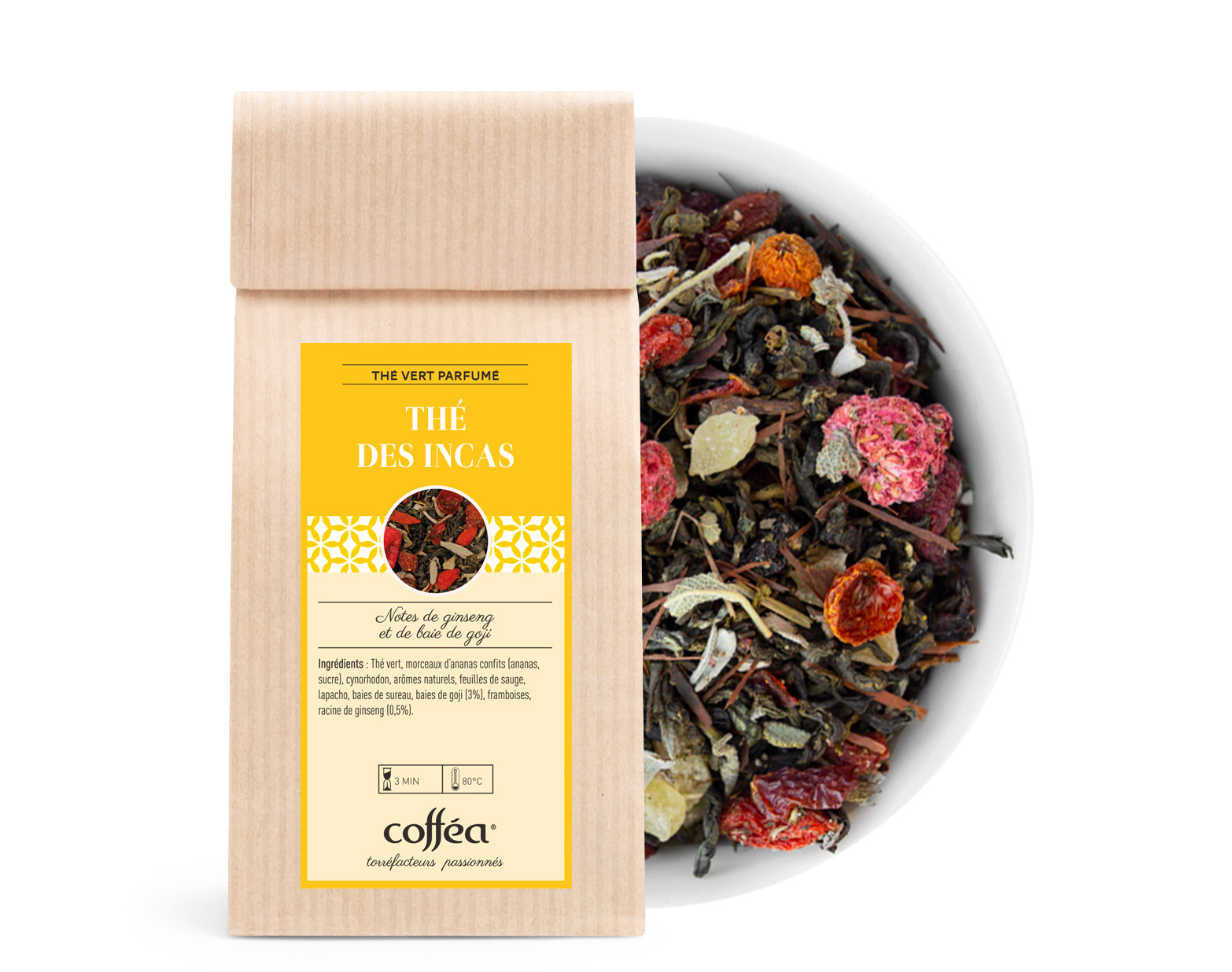 Le Thé Vert des Incas combine les vertus du thé vert avec des ingrédients puissants issus des montagnes et des forêts tropicales. Le thé vert se mêle harmonieusement avec les morceaux d'ananas confits, les baies de Goji et le ginseng, offrant une infusion pleine de vitalité. Les touches d'hibiscus, de sauge et de baies de sureau ajoutent une profondeur florale, tandis que la racine de ginseng apporte une touche d'énergie et de bien-être. Un thé qui réchauffe le corps et l'esprit, tout en étant un allié idéal pour vos moments de détente et de revitalisation