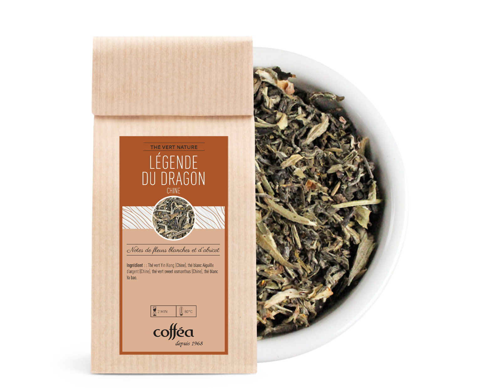 Le Thé Vert Légende du Dragon est un mélange raffiné de thés verts et blancs chinois, avec une base dominée par la fleur d'osmanthus. Cette fleur, appréciée pour son parfum de pêche, fleurit principalement en Asie de l'Est en septembre et est un symbole de joie et de chance. Ce thé floral et cristallin allie la douceur de la fleur d'osmanthus à des notes délicates de pêche et de fleurs, offrant une expérience gustative subtile et équilibrée. Parfait pour toutes les occasions, ce thé léger et parfumé peut être dégusté chaud ou froid.
