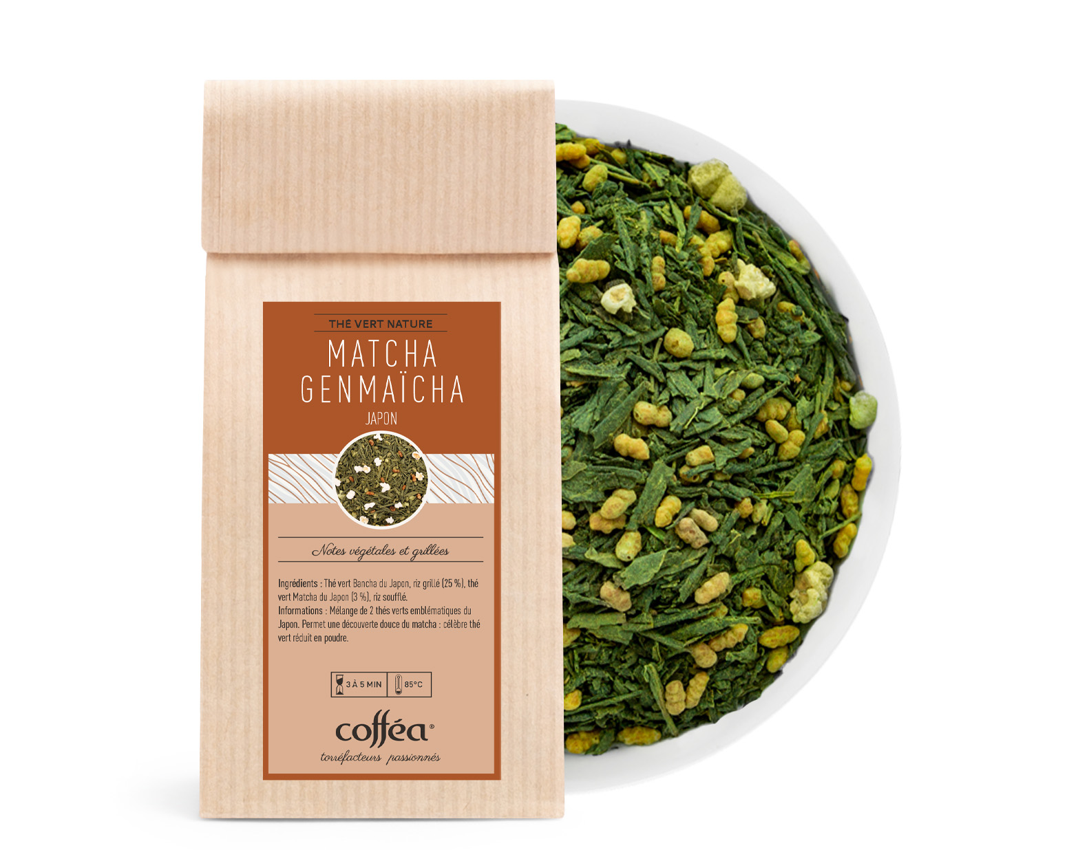 Ingrédients : Thé vert Sencha, riz grillé, poudre de Matcha.