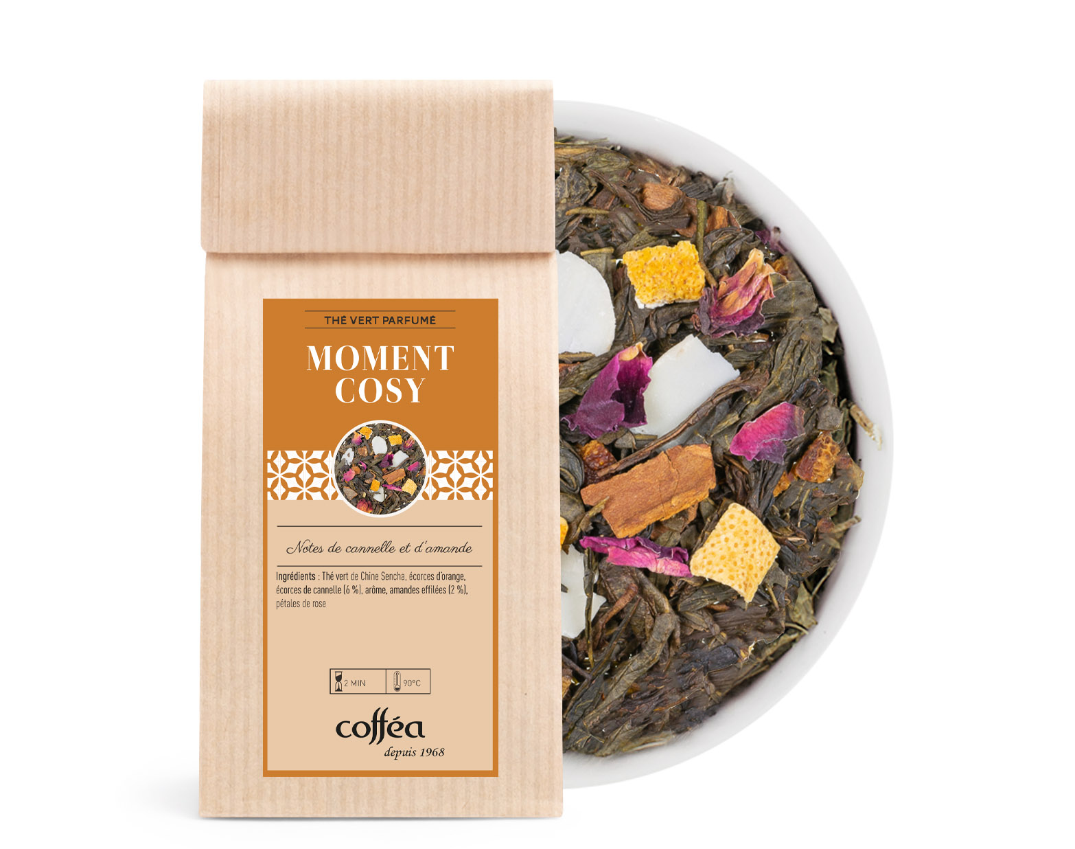 Le Thé Vert Moment Cosy combine la douceur du thé vert Sencha avec des épices chaleureuses et une touche florale, inspiré des moments de réconfort et de convivialité. Ce mélange est parfait pour savourer une pause agréable, loin du stress, et se plonger dans un moment de calme et de sérénité.