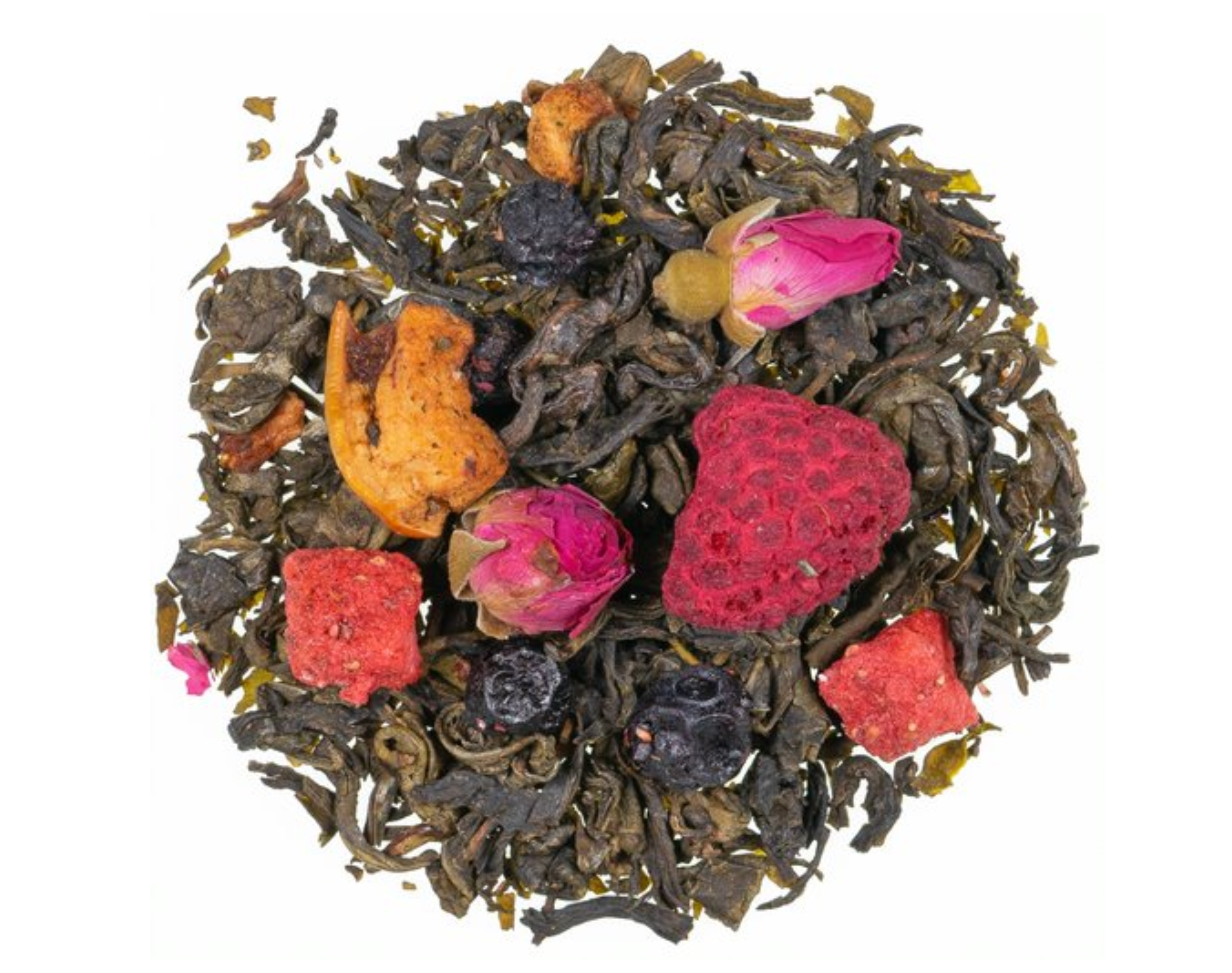 Ingrédients : Thé vert de Chine Gunpowder, thé blanc de Chine Mao Feng, rondelles de pomme, arôme naturel, morceaux de fraise, boutons de rose, framboises, myrtilles (0,5%).