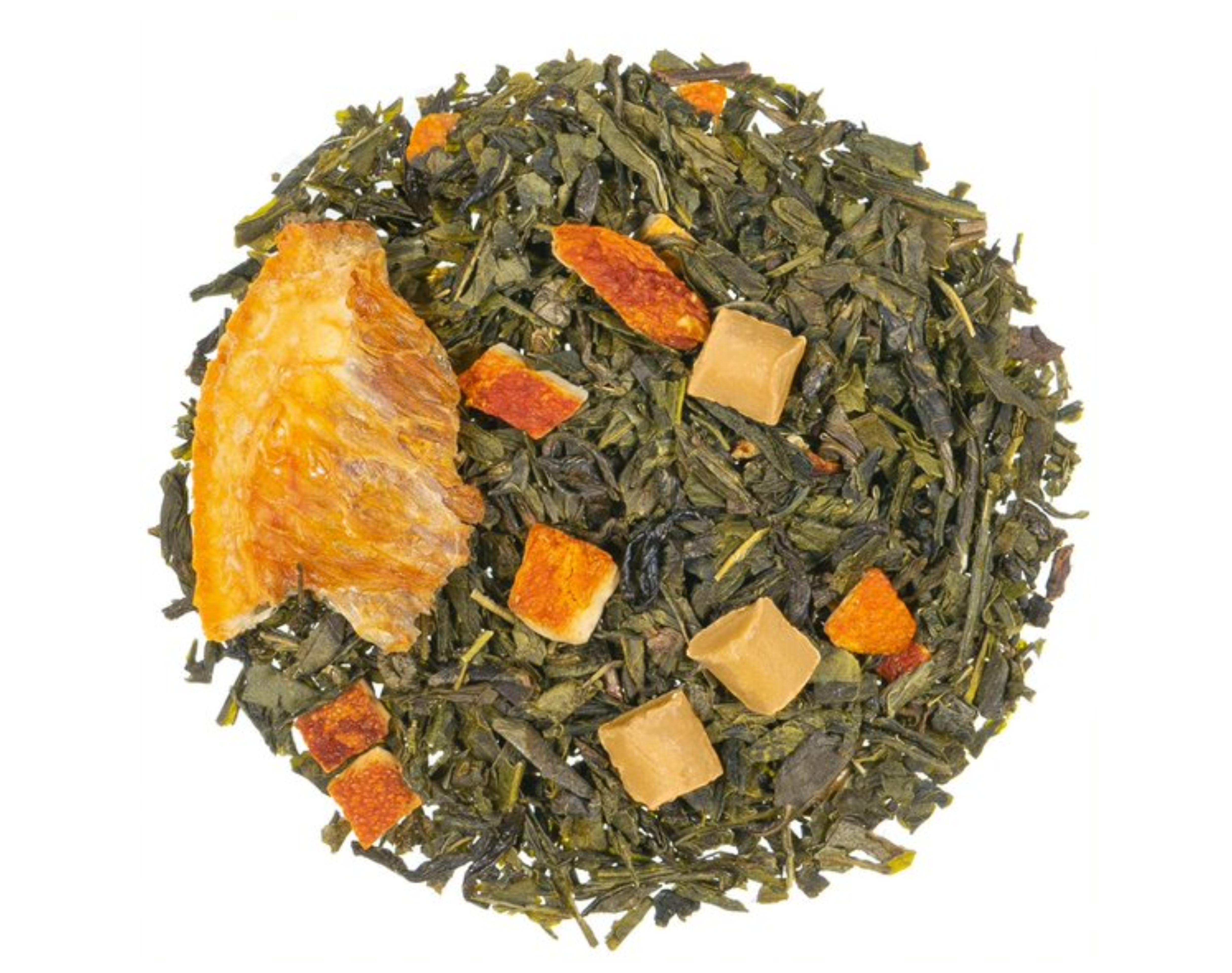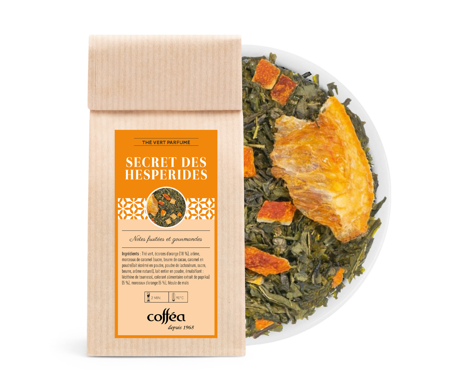 Ingrédients : Thé vert, écorces d'orange (18 %), arôme, morceaux de caramel (sucre, beurre de cacao, caramel en poudre (lait écrémé en poudre, poudre de lactosérum, sucre, beurre, arôme naturel), lait entier en poudre, émulsifiant : lécithine de tournesol, colorant alimentaire extrait de paprika) (5 %), morceaux d’orange (5 %), fécule de maïs.