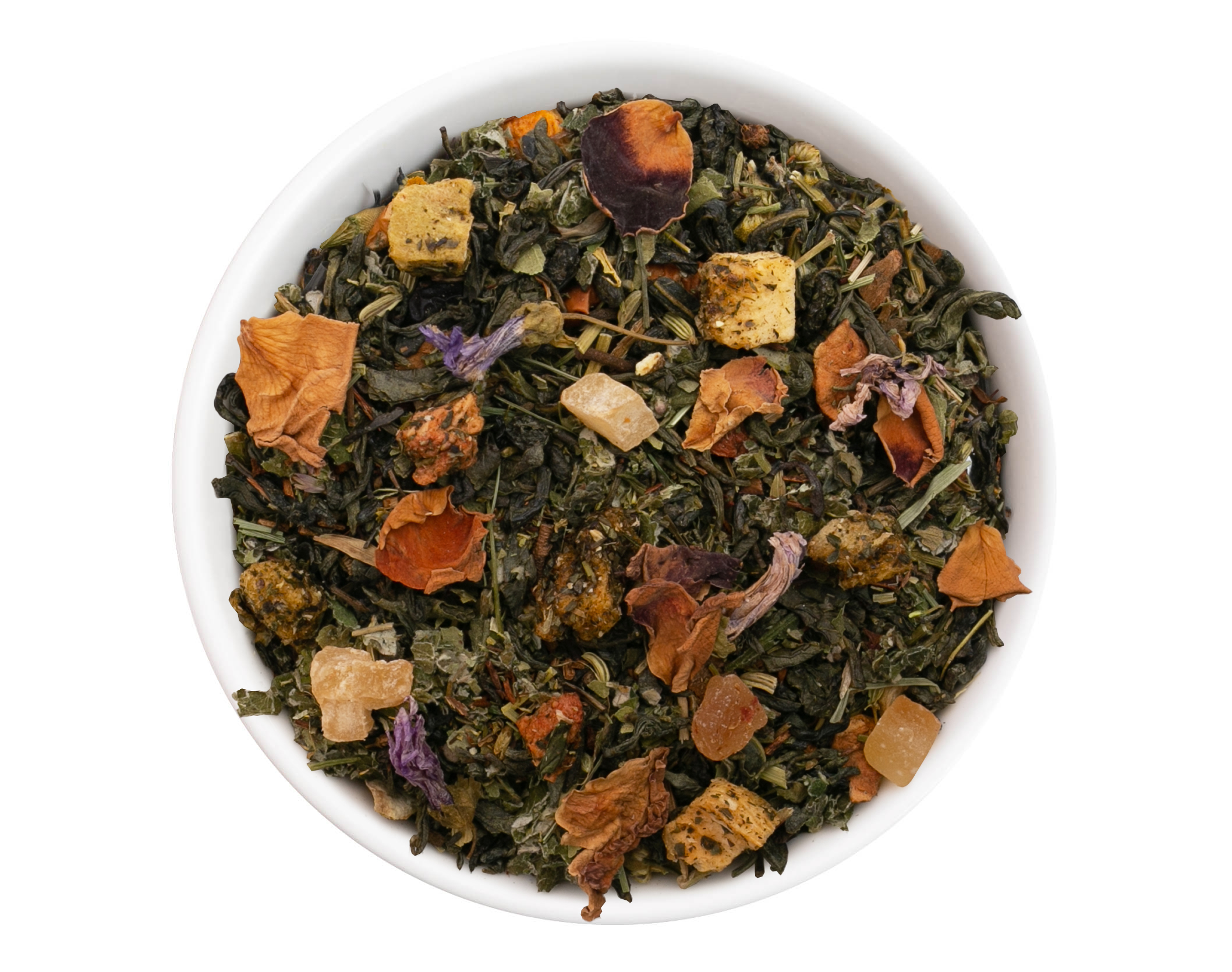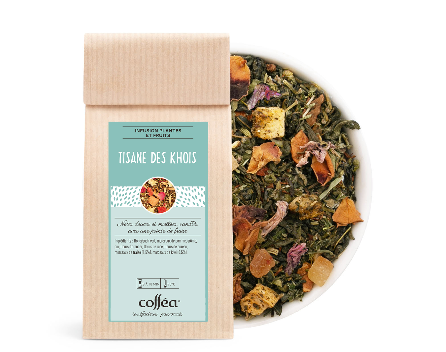 Honeybush vert, morceaux de pomme, arôme, gui, fleurs d'oranger, fleurs de rose, fleurs de sureau, morceaux de fraise (1,5%), morceaux de kiwi (0,5%)